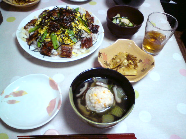 仕事を辞めてから4日経ち、衣替えや掃除をきちんと出来てなかったのでちょこちょこと家のことをしながら、のんびり生活しています 昨日は美容院にもやっと行けました~約4ヶ月も行けてなかったので、美容師さんにも「髪のすき所満載」なんて言われながら、だいぶ軽くしてもらいましたホッでも、カラーは止めておこうと思っているので完璧じゃないんですよねぇ そして、今日はマタニティピラティスの体験をしてきました体の固い私でも何とかついていける感じでした他にもヨガとかやってみて自分に合いそうなものがあったら続けてみようかなと思っています 最近の夕食 火曜日『うなぎちらし』『カブの肉詰めスープ』『筍の土佐炒め』『浅漬け』『カブの肉詰めスープ』は、クックパッドを参考にちょっと材料変えて作ってみましたカブをくり抜いて、その中にくり抜いたカブをみじん切りにしたものと鶏挽肉・人参・しょうが・塩コショウを混ぜたものを入れて、味付けしただし汁でコトコト煮るだけですヘルシーでなかなか良いと思います 水曜日『スープカレー』『大根サラダ』ずーっと食べたくて、久しぶりに作りました旦那も大喜び今回は鶏肉手羽元・かぼちゃ・にんじん・じゃがいも・ナス・ピーマン・卵を入れました野菜もいっぱい摂れるし、スープカレーは普通のカレーよりサラッといけるので暑い時期の食欲のない時にも良いですね姉が食べたがっているので、実家に行って作ってあげたいな~ 木曜日『エビピラフ(ガーリックポテト・スナックえんどう)』『鶏肉と豆腐のつくね』『トマトとわかめの卵スープ』エビが半額だったのでいっぱい作って冷凍すれば、私のランチにもなるし一石二鳥つくねは豆腐を入れるとふわっとして、美味しく出来ますね 仕事辞めてから、夕飯を楽しみに帰ってくる旦那の為に何とか頑張ってます「これも、専業主婦だから出来るんだよ」と言っておきました働いている時は疲れてしまい、あまりちゃんと作れなかったので仕事しない分、頑張らないとなー さて、今日は旦那が実家に寄ってから帰ってくるとのことなので何食べようかな明日のパンでも焼こうかな