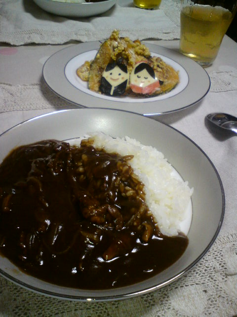 今週もお疲れ様でした今日は、とっても良いお天気でずっと続いてほしいのに~また寒くなるんですよねぇでも、ブログ上はせめて春先取りということでデザイン変更してみました さて、今日はちょっと残念な報告サンプル百貨店のRSPが繰上げ当選との連絡があったのですが、仕事+体調を考えてキャンセルしました次回?行けたら、また応募します今回は、バリバリ働きますそれも、仕事がまた延長になりました いつまでやるんだろう仕事も体はぐったりでも、気持ち的なストレスは特にないので頑張りますよ~今が私の稼ぎ時です(OL時代は無駄遣いが多く貯まらなかったので・・・) 最近疲れてしまい、夕飯も大したものを作っていないので「ひな祭り」の時の夕飯だけご紹介先日、実家で「ひな祭り」をしたので『チラシ寿司』と『ケーキ』は無し『ハッシュドビーフ』と『焼きかぼちゃのサラダ』を作りました ちょっと、お雛様作ってる最中に旦那が帰ってきてしまったので中途半端ですが・・・お雛様の両端をカットし忘れでおデブちゃんになっちゃった では、皆さん良い週末を~