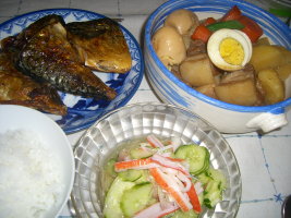 もう、嫌になるぐらい手抜きだー昨日はちゃんとしようと4時にスーパーへ行ったけど、その前にちょっと京ろまんへ。ここで着付けを習っているんで、宿題の縫い方を聞きになんとそこで2時間以上遊んでた駐車場が!1000円買い物して2時間、あとはお金で?買い物どころじゃなくって速攻家にあまりに慌てて、持って帰ってって渡された物も置いてきた。駐車場はおにいちゃんのお陰でお金はいらなかった父さんが夜8時から出かける日だから遅くても7時には晩ご飯を。家に帰ったら6時半過ぎてた最後の奥の手、ご飯早炊き、肉、ただ焼くだけ 晩ご飯 色が悪いって、フライパンで全部一緒に焼いたよ そして、今日の朝ご飯 玉子ゆでただけ。ソーセージとチーズ入れて焼いただけ そして昼ご飯 シーチキンの焼き飯 完全に手抜きだよね このだらだら病、なんとかならないものか と言いながら日記書いてるし まだ3時半なので晩ご飯、なるべくちゃんと作ろう そうだ、食パンも無いんだよね 今日の夜は父さんの仕事についていってお手伝いホームベーカリーあんたの来るの待ってるよ