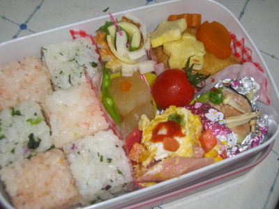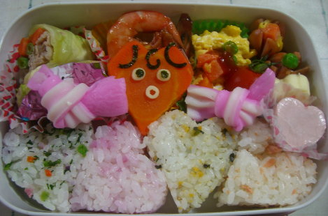 風邪で絶不調のRISAは、何故か朝シャン鼻ぐずぐずいわせながら、シャワーする身持ちがわからない父さん、7時半に車で仕事に行ったから、車にも乗れないのに出かける前に、帰り余りしんどかったら迎えに行くからと電話代を10円渡すもう10円ちょうだい!いらん事をいっぱいしゃべるから10円じゃ肝心のことが伝えきれないってことか?そんなおしゃべりなRISAの弁当は 鶏ミンチのロールキャベツ、大根と人参の煮物 、竹輪の大葉、チーズロール 鮭のホイル焼き (えのき、玉ねぎ、ピーマン、絹さや、チーズ)プチトマト スクランブルエッグ(ミックスベジタブル、ウインナー)鳴門金時 おにぎり(五色の花結び、たらこふりかけ、大根葉とごまとシラスの炒め物)今日のお弁当、おにぎりが入らず縦に使わなきゃいけなくなったなんかいつも横で使っているから変な感じ電話がかかてくるかなって待っていたけど本人がにぎやかに帰ってきた。学校に行ったら、気分がよくなったトランペットも休ませようなんて思っていたのにトランペット行くよ~若いっていうのは 回復も早いってか!