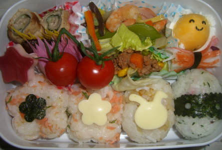 木曜日、おばあちゃんと梅田で待ち合わせたのが13時お歳暮を贈って、RISAの服を取りに行っておばあちゃんちに行く電車に乗ったのが14時半今までの最短記録お茶いっぱい飲んでませんからその理由は、おばあちゃんの友達と一緒だったからある時、4人で待ち合わせてお昼を食べる事に約束は12時10分ちょっと遅れそうになって電話したら、もう食堂に入っているってはあ?まだ11時40分ですけど私達が着く頃には、食べ終わってるでしょうよとそんなことがあって、今回は昼ごはんの約束はせずに13時に待ち合わせたんだけどお茶も無しかよってそれはもう!RISAはご立腹で、何のために待ち合わせたかわかんないしおばあちゃんと三人だと好きなもの食べさせてもらってなんか買ってもらってと楽しく過ごせるRISAだけど無茶、楽しくなかったとすねまくってたそんなRISAの今日の弁当は、 豚肉の大葉チーズ巻き、レタスのミンチ巻き(ひき肉、玉ねぎ、ミックスベジタブル) ハ宝菜(白菜、しいたけ、筍、きくらげ、玉ねぎ、絹さや、人参、豚肉、むき海老) 鰈の味醂干し、ゆで卵、かにかまぼこ、プチトマト、チーズケーキ 鮭ちらし(鮭、白ゴマ、大葉、海苔、チーズ) おにぎり(しらすとかつお節、五色の花むすび、チーズ、海苔)ダイエットエンドのみんなのこの頃のブームは、お顔のエステ3日間で3千円のエステ二本の棒で電気を流すやつで顔が引き締まるらしい。ずっとやっているとしみも消えるとか私も金、土、日とやってみる事に夜は夜で着付け教室、上級コース1日目自分磨き頑張りまーす