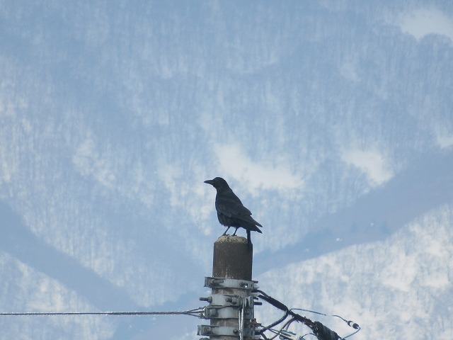 カラスが飛んできて、電柱に止まりました。