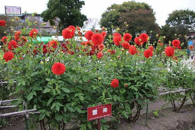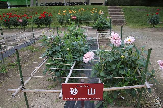 今日29日(水)は晴のち曇り、最高気温14.3度、最低気温6.0度でした。お日さまが差すと、気温は低くても暖かく感じられます。昨日は雨でしたが、我が家のモミジも色づき始めました。職場の駐車場に着くと、虹が見えました。帰宅すると、雨が降っているにもかかわらず、月が見えました。月齢6.6 明日30日が上弦の月になります。 さて、川西ダリヤ園のつづきです。(10/25)小松保育所の園児たちが、小松花屋さんの指導の下、芝生の上にダリアの花を並べて可愛い「さんぽみち」を作ってくれました。園児たちの自由な発想で生まれた作品です。 ポンポンダリアが可愛い。ハナミズキ一番奥にある水上ステージまで来ました。