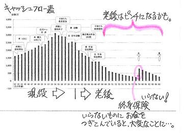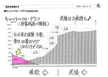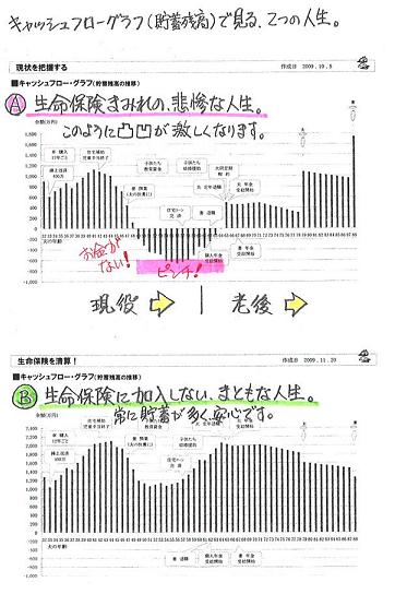 「何かあった時、どうするんだ?」たっぷり加入して安心している人、・・大勢います。どっちの人生がいいでしょうか?B・・に決まっていますよね。A・・は、保険屋さん任せで、年間数十万円の保険料を払っているケースです。「保険に加入していれば安心♪」・・と、毎年数十万円も払っていれば、なかなか貯蓄が増えません。変な時に大金を受け取ります。貯蓄残高の凹凸の激しい人生になります。生命保険加入では、必ずお金のたれ流しが発生します。〇元々・・『みんなが損をする』ことで成り立つしくみ。〇一定期間の保障を買う行為。期間経過後、お金は無くなる。〇保険料から営業マンの給料等経費が引かれる。・・できるだけ加入しないことです。( 共済系もネット生保も同じこと )上のAとBは、実は・・同じ人です。生命保険の清算!・・の前と後のグラフです。他の要素は・・いじらずに、生命保険の清算!・・だけで、人生は大きく変わる!・・という事例です。●メール顧問会員のHさん(30代) (相談:ライフプランニング)子ども2人の4人家族です。フルタイムの共稼ぎ、30代・・です。住宅ローンを返済しながら、多額の生命保険料も・・。夫の保険料は、年間37万円です。・大同生命の定期保険・あいおい損保の特約付終身保険妻の保険料は、年間32万円です。・あいおい損保の個人年金・あいおい損保の特約付終身保険・COOPの賠償責任保険あと・・2人のこどもたちも、COOPで・・。家族の合計保険料は、年70万円!・・です。こんなに保険料を払っていれば、上のグラフAのように、当然・・なります。( 大きなお金のたれ流しが起きている )彼ら保険屋さんは・・どこも、「生活設計」をすることはありません。ただ・・契約を取るだけです。お任せにしていると、とんでもないことになります。当事務所で検証した結果、夫婦ともに死亡保障は不要!・・です。・・で、妻の個人年金だけ残して「他の生命保険はすべて解約!」というシミュレーションをしたのが、上のグラフBです。同じ家計であっても、生命保険をいじるだけで、人生が大きく変化します。『お金の置き場所』 ・・しっかり考えないと。保険屋さん (保険) : 一部が給料他に引かれる。銀行等 (預貯金) : 一部が引かれることはない。今日の佐々木FP●セミナー原稿作成来週水曜日(11/25)に、セミナーがあります。聴講者は岩手の住宅建築業者さんたち・・です。担当の方が、火曜日に原稿を取りに来ます。「生命保険ほかでお金をたれ流している夫婦が、 これからマイホーム取得をする。」・・そんなシミュレーションの作成をしてもらいました。あとのページは・・私が、連休中に仕上げます。・・ということで、顧問会員の資料作成は今日はできませんでした。 スミマセン!!「行列のできるFP事務所」・・順番待ちの方々・・。お待たせしていて、たいへん申しわけありません。1 Mさん(30代):再ヒアリング 2 I さん(30代):シミュレーション3 Sさん(30代):現状診断 4 Kさん(50代):再ヒアリング5 Fさん(50代):再ヒアリング 6 Sさん(30代):再ヒアリング7 Sさん(30代):現状診断8 Sさん(30代):再ヒアリング 9 Kさん(40代):シミュレーション 10 Kさん(50代):再ヒアリング《 消費者の方へ 》 保険には加入するな!借金はするな!経費は払うな!目を覚ませ! 「家計の常識を疑え!」参照。《 顧問会員希望の方へ 》 まず、「顧問会員って何?」を熟読して内容を確認下さい。連絡・申込先fpst@axel.ocn.ne.jp