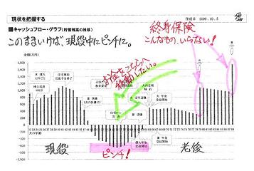 立派な診断ありがとうございます。●メール顧問会員のYさん(30代) (相談:ライフプランニング)昨晩・・家計の「現状診断」が完成して、メール添付で送りました。子どもが1人の3人家族・・です。〇さらに2人・・子どもがほしい。〇現在・・持ち家だが、将来・・立派な家にしたい。Y家のキャッシュフローは、現状では問題なし・・です。・・が、大きな2つの希望をかなえようとすると、現役時にピンチになりそうです。〇子ども費 Y家では1人・・2千万円です。 あらたに2人増えると、プラス4千万円!・・です。〇マイホーム こちらは具体的に聞いていませんが、 少なくとも・・プラス1千万円強!・・?これら・・希望のことを踏まえると、現状のままでいいわけがありません。どうする?改善余地は十分にあります。 Y家の場合も、生命保険!・・です。( アタマの切り替えが可能であれば・・ですが )生命保険では、2つの側面から改善を検討します。1 必要な保障額、適切な加入のし方、になっているか?2 お金の置き場所は適切か?さっそく、メールをいただきました。 ※は私の声。 こんにちは。 立派な診断ありがとうございます。 7月の時点で出していれば 順番待ちもなくスムーズにできたかも しれないなぁと思いながら、 ブログのYさんはまだかな? っと毎日ブログを見ていました。 立派な資料で、 頭をフル回転で理解しようとしていますが、 年金関係で思考停止になりそうです。 まず、私が理解してから旦那に説明しないと この資料を見せても見ない(おまかせしそう)なので、 がんばって理解しますが、頭が痛いです。 ※一般の顧問会員の場合は直接面談して 資料説明をするので、簡単に理解が深まりますが・・、 メール顧問会員の場合は・・ちょっと気の毒です。 ・・ 略 ・・ いくつか、質問があるのですがよろしくお願いします。 以下・・5つの質問が並んでいますが、 ボリュームが大きく、いっぺんにお答えできません。 ・・ので、今回は・・ 人生全体の「お金の置き場所」に係わる部分の質問を ピックアップしてコメントします。 質問1 年金について 夫婦としての年金受給レベルは少なめとのことですが、 受給額を上げる方法は何かないでしょうか? ・・ 略 ・・ ※いくつか方法がありますが・・どれも、 現役時のお金を老後に送ることになります。 老後はすでに潤沢です。 公的年金を受給できる状況にさえすれば、 年金額を増やそう(現役のお金を減らそう) ・・とは、考える必要はありません。 質問2 生命保険について 個人年金について 所得税・住民税の額が保育料金に関わってくるため、 少しても節税の為に今年から掛けました。 どの程度効果はあるかわかりませんが、 貯金もできて保育料も安くなればという考えでしたが、 これも解約した方がいいですか? ※新たな子ども費だけで、現役時は資金不足に・・。 老後はすでに潤沢です。 長期共済について 減額ではなく解約した方がいいですか? 退職時に加入していないと退職者共済に はいれないのですが・・・・。 元本割れでも解約して 貯金にまわした方がいいのですか? 自分の中で老後の貯金と思っていたのです ※老後の資金はすでに十分です。 退職者共済の要件を確認の上、最低限に。 質問3 子供の人数について 子供が1人だった場合は 大学まで育英会なども借りずに 教育費をだせるということですよね? 2人目までは何とかなりそうな気がしますが、 3人だと教育ローンって事なのでしょうか? ※私の提言の一つ・・「借金はしない!」 できるだけ・・キャッシュで計画します。 質問4 長期共済・個人年金について 夫が死亡してからも〇千万のお金があっても いらないので、長期共済、個人年金を解約して 子供の教育費に充てて3人目までの教育& 生活費を捻出するという意味でしょうか? ※新たな子ども費やマイホーム資金・・です。 質問5 個人年金と長期共済で老後に受け取る金額は 736万で私の死亡保険が300万で1036万は 返ってくるお金なのでしょうか? ※老後に受け取るための積立ては不要・・です。 質問攻めですが、よろしくお願いします。 自分で選んで入った保険&年金を解約するのは なかなか勇気がいりますね。 寝たきりになれば、付きそう人も負担がかかると 思いますし、 あぁ保険に入ってて良かったって 言っていた人が多いので^^;。 私の親は年金をたくさん掛けているらしく、 植物人間でも生きているだけで丸儲け~♪ で介護する人に負担にならないようにしている みたいなので、 すっぱり頭を切り換えるのに時間がかかりそうです ※「あぁ保険に入ってて良かった♪」 ・・と言っている人、自分が今まで払った 保険料の総額を知りません。 (^^ゞ 払ったお金の一部を受け取って感激しています。 表彰状ものの・・おバカさんです。 (失礼!)文面から強く・・にじみ出ています。保険屋さんの洗脳・・。日本人のDNA・・になってしまっています。「保険に入っておけば、安心だ。」頭を切り替えないと、延々とお金をたれ流しま