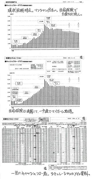 一生をシミュレーションしてみました。●メール顧問会員のYさん(30代) (相談:ライフプランニング)家計の現状診断は、すでに終了しています。キャッシュフローは、老後まで問題なし。しかし、生命保険に問題あり。このままでは大金をたれ流します。 ・年間保険料 : 約50万円 ・払込保険料総額 : 約1,580万円 内・・給付金等 : 410万円 内・・保障コスト : 約1,170万円 ( 保障コスト = たれ流すお金 )子ども2人の4人家族、フルタイムの共稼ぎ夫婦・・です。生命保険の必要額・・算出結果は、夫 : 現在・・不要、10年後も不要。妻 : 現在・・800万円、10年後・・不要。結論!Y家で必要なのは、妻の死亡保障のみ!医療保険や医療特約は、元々いらない。貯蓄性の保険は・・その損得を検討して、残すかどうか決めますが・・、あとは・・いっさい不要! とっとと解約!・・で、生命保険の清算が終了します。で・・今回は、マイホーム取得のシミュレーション作成・・の依頼を受け、作成しました。現在所有して住んでいるマンションを出て、一戸建てマイホームを取得したら・・、我が家の一生はどうなる? ・・というシミュレーション。結論 : 何ら・・問題なし。むしろ、一生マンション住まいよりも、キャッシュフローが潤沢になりました。これからの生涯の『住居費の総額』は・・一生・・マンション住まいでは、約5,300万円。一生・・一戸建て住宅では、約7,900万円。『住居費総額』が多くなるのにもかかわらず、キャッシュフローが潤沢になった理由は・・?〇生命保険の清算!〇マイカー費用の見直し! 購入価格は、400万円⇒250万円に。 買換えスパンは、7年ごと⇒9年ごとに。マイホーム取得を検討する人は、まず・・家計の整理せいとん!・・をしましょう。以下は、Yさんのシミュレーション資料です。小さくて・・細部は見にくいと思います。わざと、見にくくしています。 (^^ゞ( 貴重な個人情報なので・・ )キャッシュフローグラフ(貯蓄残高の推移)は、上が「現状診断」時点、下が「シミュレーション」後です。下の方が、貯蓄残高が多くなっています。家計を整えてかかれば、住宅取得をしても問題なし!ライフプランニングでは、必ずこのようなキャッシュフロー表を作成して、これからの生涯を眺めてみます。色々な資料を作成する中で、これがメインの資料になります。マイホーム取得シミュレーションでは、以下のような資料も作成します。〇マイホーム資金計画書〇死亡保障必要額 計算書 ( 状況が変われば、必要額も変わります )きちんとキャッシュフロー表を作成していれば、死亡保障必要額は・・現時点だけではなく、将来のどの時点の数値も算出できます。今回のYさんのケースでは、3つの時点で算出しました。〇現時点 〇マイホーム取得直後 〇10年後 Yさんのライフプランニング(生活設計) 進行状況 1 ヒアリング 家族状況・家計収支・資産・職歴ほか 2 家計の現状診断 診断資料(小冊子) 問題点把握 3 生活設計 シミュレーション 設計資料(キャッシュフロー表ほか) 4 実行支援 商品選択や処理(金融商品・保険・ローンほか) 住宅・不動産・相続等の段取り・手続き 5 事後チェック 計画の実行・・進行状況、必要に応じた修正今日の佐々木FP●メール顧問会員のYさん(30代) (相談:ライフプランニング)昨日から「現状診断」資料の作成作業をしています。・キャッシュフロー表・公的年金受給額計算 夫婦それぞれ・生命保険一覧表・不動産一覧表・・等々を並行して進めています。「不動産が多くて・・たいへんだぁ・・。」この後・・以下の資料を作成します。・遺族年金受給額計算・死亡保障必要額計算 夫婦それぞれ「月曜日には終わると思います。」 ・・だそうです。「行列のできるFP事務所」・・順番待ちの方々・・。1 Yさん(30代):現状診断 ← 作業中・・です。2 Mさん(30代):再ヒアリング3 I さん(30代):シミュレーション4 Sさん(30代):現状診断 5 Kさん(50代):再ヒアリング6 Fさん(50代):再ヒアリング 7 Sさん(30代):再ヒアリング8 Sさん(30代):現状診断9 Sさん(30代):再ヒアリング 10 Kさん(40代):シミュレーション 《 消費者の方へ 》 保険には加入するな!借金はするな!経費は払うな!目を覚ませ! 「家計の常識を疑え!」参照。《 顧問会員希望の方へ 》 『身内』として厳しく真剣に支援。「顧問会員って何?」を熟読の上、連絡先fpst@axel.ocn.ne.jp