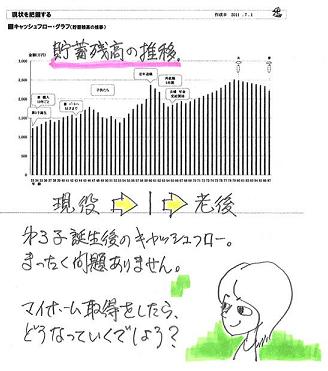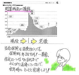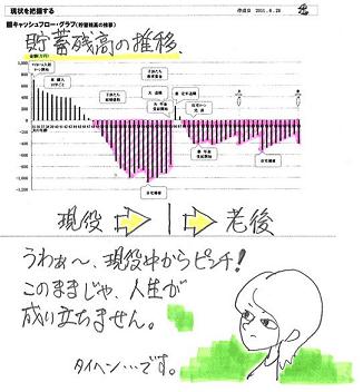 落ち込みました・・。 写真と記事は関係ありません。〇メール顧問会員のTさん(30代) (相談:ライフプランニング)6/28、現状診断が完成、メール添付で送りました。 T家の概要 家族 : 夫30代、妻20代、幼児2人 仕事 : 夫:自営業 妻:会社員 住居 : 持家(住宅ローン有り)夫婦共稼ぎでも、妻の収入の方が圧倒的に多いケース・・です。このようなケースでは・・ほぼまちがいなく、夫に生命保険は不要!・・です。T家の場合もその通りで、死亡保障必要額は・・夫 : 現在も将来も不要。妻 : かなり高額の保障が長期間必要。・・という結果が出ています。キャッシュフローは、以下の通り大変な状況です。(マイナス最大値:約1千万円)このままでは、人生が成り立ちません。この異常な状況を前提に計算した「妻の死亡保障必要額」は、意味を成さないと思われます。生活が成り立つようにキャッシュフローを改善した後に、改めて死亡保障必要額の計算を行ないたいと思います。メールをいただきました。 ※は、私の声。 武田 様 おはようございます。 〇〇のTです。 現状診断、ありがとうございます。 結果を見て、 40代後半から大変な状況になる とは思っていなかったので 落ち込みましたが、 ※まともにこれを見たら、 だれでも凹む・・と思います。 早くわかって良かったというのが 正直な気持ちです。 ※すばらしい! 前向きに考えましょう! 主人は生命保険が必要無いようなので、 解約手続きを進めたいと思いますが、 元上司が代理店をしているので、 あまり気が乗らないようです。 ※夫の生命保険3本をこのまま 継続すれば、たれ流すお金の 総額は、約430万円!・・です。 (もったいない・・) 430万円も差し上げるほど、 義理立てしなきゃないでしょうか? その・・元上司に。 キャッシュフローの改善には、 この数百万円が大きく貢献します。 (ぼぉ~っとしてる内に自動引落とし) 私の方は必要額が高額ですね・・・。 ※はい、ありえないほど・・高額です。 キャッシュフロー改善後に、 あらためてきちんと計算しましょう。 言われたとおり、 とりあえず3000万の保障を と考えていましたが、 ※はい、具体的な金額判明まで 「とりあえず清算!」で、 三角形の保険で3,000万円を 確保しておきましょう。 2日に会社のセミナーがあり、 会社の死亡弔慰金が 2000万出るそうなので、 ※お!それは大きい! ヒアリング時点で調べるべき ・・でした。 (^^ゞ とりあえず、1000万の保障を 確保すればいいでしょうか? ※はい、「とりあえず清算」としては、 そういうことですね。 合計で3,000万円。 その他に高額医療を受けても 健保から補助があるそうです。 会社の保障についても 勉強しなおさないとと反省しています。 ※日ごろからきちんと勉強して おきましょう。 毎月・・給料天引きで保険料を 負担しています。 収入、支出についても見直しをして、 ピンチにならないように 改善していきたいと思いますので、 今後とも宜しくお願い致します。 ※大きな要素は・・ ・夫の収入 ・生命保険料 ・・です。 この2つが変わることで、 キャッシュフローグラフが ガラッと変わります。 別人の人生のように・・。 マイナス1千万円をひっくり返せ! がんばれ! がんばれ!!Tさんのライフプランニング(生活設計) 進行状況 1 ヒアリング 家族状況・家計収支・資産・職歴ほか 2 家計の現状診断 診断資料(小冊子) 問題点把握 3 生活設計 シミュレーション 設計資料(キャッシュフロー表ほか) 4 実行支援 商品選択や処理(金融商品・保険・ローンほか) 住宅・不動産・相続等の段取り・手続き 5 事後チェック 計画の実行・・進行状況、必要に応じた修正《 質問希望? 》 まずブログ右帯の記事を読んでください。よくある質問の答えがあります。(「家計の常識を疑え!」他)《 顧問会員希望? 》 「顧問会員って何?」で支援内容や当事務所との関係を確認の上、右記へ fpst@axel.ocn.ne.jp