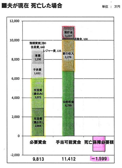 妻の稼ぎが多ければ・・必要額は少なくなり、さらには・・不要になる・・場合も、多々あります。 写真と記事は関係ありません。 ・・ヨダレが。〇メール顧問会員の I さん(30代) (相談:ライフプランニング)7/13(水)・・に現状診断を終えて、メール添付でデータを送っています。 I 家の概要 家族 : 夫30代、妻30代、幼児2人 仕事 : 夫:会社員 妻:専業主婦 住居 : 賃貸 ※生命保険は、夫婦ともに不要! ・・という結論が出ています。 「幼児が2人いる30代の夫婦」 なのに、「生命保険は不要!」・・です。 そんなに珍しいケースではありません。 ※ I 家がこれからマイホーム取得を検討 する場合の目安。 キャッシュフロー表の「総合計」より・・ ・住居費総額 : 5,319万円 ・最終貯蓄残高 : 4,077万円 ・払込み保険料総額 : 1,585万円 合 計 : 1億981万円 マイホーム取得後の「生涯住居費」が この金額以内に納まれば、 現在の生活レベルを変えずに 住宅取得が可能!・・ということです。 (楽勝・・です)メールをいただきました。 ※は、私の声。 エフピー・ステーション 武田様 こんちには。 〇〇の I です。 現状診断ありがとうございました。 とりあえず、現状のままでも問題は あまりないことが認識できました。 ※はい、安心できる キャッシュフロー・・です。 現在私が死亡した場合の必要額は 妻の収入にかなり左右されるのですね。 ※はい、お互い様で・・ 配偶者の収入次第で 必要額は大きく変わります。 よくよく考えてみると妻が実家に戻り、 すぐにこの収入を確保できないのでは ないかと思いました。 ※ホントは・・ヒアリングの時に、 「よくよく考えて」欲しかった・・。 (^^ゞ 保育園も入らなくてはいけなくなりそうですし。 子供手当ても当てには出来ませんしね。 そう考えると ある程度(500万~1000万)の 生命保険が必要なのでは、と思いました。 もちろん10年後(5年後にも?)には 必要ありませんが。 あと、将来はマイホームも どれくらいの規模が実現できるか も理解できました。 もし、このブログに出会ってなければ これから無駄にお金を垂れ流していた ことだと思うと私は幸運でした。 ただ、やはり 直接面談して説明を受けられれば 一番良いかと思っております。 8月17日PM~19日AMの間の どこかの時間にそちらを訪問しても よろしいでしょうか。 ※おっ! そう・・ですか!? 素晴らしい。もちろんOK!・・です。 直接面談した方が、はるかに 理解が深まります。 8月14日~20日で妻の実家 (〇〇県の〇〇ですが) に帰るのでついで(それでもまだ半分?)に 岩手まで足を伸ばそうかと考えております。 いかがでしょうか。 可能であれば都合の良い日時を お知らせいただければ幸いです。 よろしくお願いします。 ※了解しました。 「8月17日PM~19日AM」 ・・は、 今日現在・・まだフリーです。 面談が以下の時間帯に納まるよう、 希望の日時を指定して、 早めにお知らせください。 ・AM10:00~12:00 または・・ ・PM1:00~4:00 実現すれば、最も遠距離の メール顧問会員の面談になります。生命保険の必要額は、配偶者の収入に大きく左右されます。生命保険の必要額は、それぞれの家族の事情によって、まったく別の結論が出ます。基本的な算式は・・「必要資金」-「手当可能資金」 ・・です。「手当可能資金」の方が多ければ、生命保険は要らない!・・ということです。「手当可能資金」には・・・「公的年金」・「妻(配偶者)の収入」・「貯蓄」・・などがあります。これらが多ければ多いほど、生命保険は不要!・・という方向に傾きます。なので、「妻の収入がしっかり多い。」というようなケースでは、夫の生命保険は不要になります。 妻にある程度の収入があれば、 「夫に生命保険は不要」・・という結論が出やすい。 妻が亡くなっても生命保険が要らない ・・ケースが多いのは、 「夫の収入が多い」ことが、最大の理由です。 夫が現在死亡した場合(左)と10年後に死亡した場合(右)。 現在も生命保険は不要だけど、将来はもっと不要。 妻が現在死亡した場合(左)と10年後に死亡した場合(右)。 現在も生命保険は不要だけど、将来はもっと不要。今日の佐々木FP〇メール顧問会員のTさん(40代) (相談:ライフプランニング)現状診断の資料作成。本日 着手!・・しました。長らくお待たせしました。【 行列のできるFP事務所 】 資料作成の順番を待っている顧問会員の行列です。 お待たせしています。大変申しわけありません!1 Hさん(40代):現状診断 回答待ち。(12/13ヒア)2 Kさん(30代):シミュレーション 回答待ち。(4/4着)3 Mさん(40代):現状診断 回答待ち。(4/19着)4 Tさん(40代):現状診断 今日の作業。(4/21着)5 Sさん(30代):シミュレーション 4/26依頼到着。6 Sさん(20代):現状診断 4/28 シート到着。7 Tさん(30代):現状診断 5/7 ヒアリング。8 Oさん(40代):シミュレーション 5/12依頼到着。9 Tさん(20代):シミュレーション 5/12依頼到着。10 Dさん(30代):現状診断 5/13 ヒアリング。11 Kさん(30代):現状診断 5/19 シート到着。12 Tさん(30代):現状診断 5/20 シート到着。