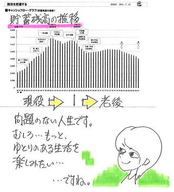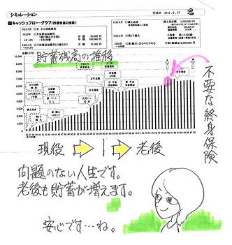 ・・なんて言い始めました。今さらになって・・夫が。(正直イラッとしたんですが) 写真と記事は関係ありません。〇メール顧問会員のSさん(30代) (相談:ライフプランニング)顧問会員になった・・のは、5/17(火)です。即 ヒアリングシートを送りました。・・が、何の音沙汰も無く・・2ヶ月以上の時が過ぎ去りました。メールをいただきました。 ※は、私の声。 武田様 佐々木様 お世話になっております。 〇〇県のSです。 ずいぶんとのんびりしてしまった シート記入ですが、 ※はい・・そのようです。 (^^ゞ やっと送ることができるようになりました。 こんなに支出しているのかと 改めてガッカリしました。 ざっくりと生活費でしたが、 ここにもかなりの無駄があるようです・・・ ※ヒアリングシートの記入作業の中で、 大部分の人が大きく反省します。 改めて色々なことに気付かされる ・・ようです。 いまさらになって夫が、 保険やめた途端病気やけがをしたら・・・ なんて言いはじめました。 ※おいおい・・オット・・。 《シンプルに考えよう》 『病気になった方が お金がかからない!』 『保険加入=お金を失うこと!』 『医療保険には加入しない 方がお得!』 正直イラッとしたんですが、 ※そりゃあ・・イラッとする・・よな。 今入院しても大丈夫なくらい 貯蓄はあるんですけどね... ※貯蓄が無い人ほど、 保険に入って備えるのではなく、 『貯蓄を増やして備えろ!』 《シンプルに考えよう》 ブログにも国より保険会社を信用!? なんて記事がありましたが、 今、国を信用するのもしんどいですね。 不安になります。 ※どうのこうの言っても、 国が破綻したら、私たちの 生活は成り立ちません。 書類はメール添付できないので、 後日ファックスします。(今日、明日中に) ファックスは実家で借りようと思うのですが、 そちらからファックスで送られてくる、 ということは無いですよね? (親には秘密ということで・・・) 長くなってしまいましたが、 どうぞよろしくお願いします。また、メールをいただきました。 武田様 佐々木様 お世話になっております。 〇〇県のSです。 先日、シート送信の際に 書類をファックスすると ご連絡しましたが、 風邪を引いてしまい気がついたら 23日が終わろうとしていました。 ※あれ? そうだったんですか? 申し訳ありません。 体調が戻り次第送ります。 どうぞよろしくお願いいたします。 ※よろしく、お願いします。 武田様も佐々木様も 夏風邪などお気を付け下さい。 ※だいじょうぶです。 風邪を引かない人種・・です。 (^^ゞSさんのライフプランニング(生活設計) 進行状況 1 ヒアリング 家族状況・家計収支・資産・職歴ほか 2 家計の現状診断 診断資料(小冊子) 問題点把握 3 生活設計 シミュレーション 設計資料(キャッシュフロー表ほか) 4 実行支援 商品選択や処理(金融商品・保険・ローンほか) 住宅・不動産・相続等の段取り・手続き 5 事後チェック 計画の実行・・進行状況、必要に応じた修正〇メール顧問会員のNさん(30代) (相談:ライフプランニング)現状診断を終えた・・のは、5/11(水)です。メールをいただきました。 武田様 佐々木様 お世話になっております。 だいぶご連絡が遅れ、 申し訳ございません。 現状診断でご指摘いただきました通り、 保険をすべて解約いたしました。 ※おっ! 素晴らしい! 現状診断では、夫婦ともに 現在も将来も生命保険は不要! ・・という結論でした。 続いて、シミュレーションを お願いしたいと思うのですが、 依頼内容としては次の通りです。 1 平成24年に第2子誕生誕生で、 今後の生活設計が どのように変わりますか? 保険は必要になりますか? 2 平成24年から自宅を建築 する場合のローンの組み立て方は、 どのようにすれば よろしいでしょうか? (予算は〇〇万円~〇〇万円を想定) (とりあえず、添付のように 現状診断をいじってみました。 保険の見直しを反映させて、 しばらく車を1台にすることで、 マイナスにはならないかと 考えておりますが、 どうぞアドバイスをよろしく お願いいたします。) ※シミュレーションの作成で、 さっそく行列に並んでもらいました。 ※基本的に心配無用! これからの保険料総額 (すべて捨てるお金)は、 1,167万円・・でした。 すべて解約済みということなので、 この大金が家計に残ります。 (非常に大きい!) 住居費総額は4,986万円で、 生涯の貯蓄残高は5,763万円、 その合計額は1億円を超えます。 マイホーム取得で発生する これからの住居費総額は・・ 数千万円で済みます。 =現在の生活レベルを変えずに、 マイホーム取得ができる! ・・ということです。 子ども費1人分は1,324万円で、 かなり少なめなので、あと1人 増えても、家計にかかる負荷は たいしたものではありません。 住宅取得と第2子誕生が同じ年に 起これば、『生命保険不要!』の 状況は変わらないものと 思われます。Nさんのライフプランニング(生活設計) 進行状況 1 ヒアリング 家族状況・家計収支・資産・職歴ほか 2 家計