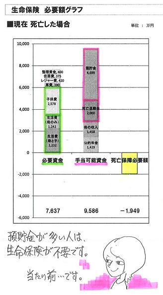 子供が成人になるまでの期間ですよね?!おバカさん!・・です。 (失礼!)「子どもが独立するまでは・・。」「子どもが成人するまでは・・。」『生命保険が必要』・・と考えるのは、( いかにも、もっともらしいけど・・ )ただの迷信、・・です。「いつまで必要か?」・・という以前に、「そもそも我が家に生命保険は必要か?」・・ということを、真剣に考えましょう。「子どもが産まれたら生命保険に加入。」これだって、ただの迷信です。「幼児が2~3人いても生命保険は不要!」・・というケースはいくらでもあります。『保険加入=お金を失うこと!』 ・・です。「生命保険必要額の考え方」・・を、しっかり理解しましょう。 写真と記事は関係ありません。メールをいただきました。イチゴさん ・・からです。 ※は、私の声。 ★は、予想される保険屋さんの声。 こんばんは。 ブログを拝見して、勉強中です。 先日、三角形の生命保険に 入りなおしましたが、 その後で、二人目が来年、 生まれてくることがわかりました。 保険会社に変更を 申し出た方が良いでしょうか? ※答えようがありません。 (^^ゞ 加入した保険金額が妥当なのか どうかも分かりません・・ので。 ★はい、すぐ保険会社に相談した 方がいいと思います。 新たに 大きな保障額で契約して、 安心な状況を作っておきましょう。 あとから、変更することは 出来るのでしょうか?? ※私ではなく、その保険を売った 相手に聞いてください。 基本的に・・減額はOKでも、 増額はダメ・・だと思います。 ★保険会社が、ご要望に沿って 対処してくれると思います。 素直に相談されたらいいです。 二人目の子供が 成人になるまでの期間を 延長すれば良いのですよね?! ※答えようがありません。 (^^ゞ そもそも生命保険が必要か どうかも分かりません。 仮に必要でも、それがいつまで かも分かりません。 ★お子様が成人されるまでではなく、 独立されるまで、さらには・・ ご夫婦のみになる期間も含めて、 いつ何が起こるか分かりません。 生涯に渡って、手厚く備えておく ことをお奨めします。期待した回答でなくて申しわけありませんが、せっかくですから・・「消費者のための生命保険の基本」・・を理解して帰ってください。『生命保険必要額の考え方』生命保険は、遺族の生活保障が基本です。たとえば・・夫が死んだ場合の、遺族の以後の一生の生活を考えます。・妻子の生活費・妻のみの生活費(死ぬまで)・子ども費(教育費や援助費)・車・レジャー費・住居費・葬式代 ・・など。これらの合計額が『必要資金』・・です。これがそのまま必要額・・には、なりません。『必要資金』に対して、自前で用意できるお金があります。これを、『手当可能資金』・・と言います。・公的年金・妻の収入・死亡退職金・預貯金 ・・など。これらの合計額が、『手当可能資金』・・です。・・で、『必要資金』から『手当可能資金』を引いた額が、『生命保険の必要額』・・です。『必要資金』 > 『手当可能資金』・・ならば、生命保険が必要ですが、『必要資金』 ≦ 『手当可能資金』・・であれば、生命保険は不要!・・ということです。以下は、具体的な事例です。子ども3人の30代夫婦、顧問会員のNさん・・です。夫の死亡保障必要額の計算結果です。現時点と10年後を見ています。 N家の概要 家族 : 夫30代、妻30代、幼児2人、 ( さらに第3子出産予定 ) 仕事 : 夫:会社員 妻:専業主婦 住居 : 賃貸(マイホーム取得希望)『必要資金』 ≦ 『手当可能資金』・・です。子どもが3人いても、生命保険は不要!・・です。『必要資金』 ≦ 『手当可能資金』・・です。子どもが3人いても、生命保険は不要!・・です。生命保険は不要! ・・というケースは、どんな特徴が?上のグラフからも明らか・・ですが、〇支出が少ない。(必要資金)・生活費が少なめ。堅実な家計。・子ども費が少なめ。・車・レジャー費が少なめ。・住居費が少なめ。 持家なら、少なめ。 賃貸なら、かなり多め。〇収入が多い。(手当可能資金)・遺族年金・老齢年金が多め。 自営業者は、これが少なめ。・妻の収入が多め。 これが以外に大きく貢献する。・死亡退職金が多め。・預貯金が多め。 貯蓄できる体質の人は、 生命保険が不要になりやすい。それぞれの家族によって、収入支出の状況は大きく異なります。ドンブリ勘定で・・3千万円!・・でいいわけがありません。(保険屋さんはドンブリ勘定・・です)我が家の特徴をしっかり見極めましょう。顧問会員のNさん(30代)が現在も将来も生命保険が不要なのは・・「生活費が少なめ!」・・これが、最大の理由です。今日の佐々木FP〇顧問会員のSさん(40代) (相談:ライフプランニング)現状診断の資料作成作業。【 行列のできるFP事務所 】 資料作成の順番を待っている顧問会員の行列です。 お待たせしています。大変申しわけありません!1 I さん(40代):現状診断 回答待ち。(9/27着)2 Hさん(40代):現状診断 回答待ち。(12/13ヒア)3 I さん(30代):現状診断 