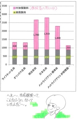 保険屋の取り分が多ければ、高い保険料になる。(当たり前)ま・・、生命保険には、できるだけ入らないこと・・です。家計が大幅に改善できます。(当たり前)しっかり・・生活設計をしよう。 じぇじぇ! 八重の桜生命保険の保険料・・って、どうやって決まっているんでしょう? 保険屋さんの取り分って、どれくらいなんでしょう?つい最近まで、まったく分かりませんでした。生命保険業界全体が・・どこも、内訳を明らかにしなかったから・・。ところが、ここに来て、ライフネット生命が業界のタブーを破り、自社の保険料の内訳を明らかにしています。1社が明らかにしたことで、他の保険会社の保険料の内訳も分かるようになりました。(たとえ・・発表していなくても)死亡保障を対象にした「定期保険」で見てみましょう。30歳男性、1,000万円、保険期間10年。(10年間1千万円保障・掛け捨て保険)1か月の保険料の内訳を比べてみます。保険の原価は各社同額です。保険料の高い・安いは、その保険会社の取り分次第で決まります。(ピンクが保険屋の取り分)左から2社がネット生保・・です。左端が単独で保険料の内訳を発表したライフネット生命保険です。保険料月額1,328円の内・・保険の原価は890円で、(死亡:1,000万円の 保障に充てるお金が890円)ライフネットの取り分は438円・・です。原価が890円と分かりましたから、(同じ条件の同じ保険は 原価がまったく同じ)他の保険会社の保険料からその保険会社の取り分が分かることになります。保険料月額 ライフネット生命 1,328円オリックス生命 1,310円明治安田生命 2,670円日本生命 2,800円メットライフアリコ(標準体) 2,290円メットライフアリコ(非喫煙優良体) 1,140円各保険会社の取り分ライフネット生命 438円オリックス生命 420円明治安田生命 1,780円日本生命 1,910円メットライフアリコ(標準体) 1,400円メットライフアリコ(非喫煙優良体) 250円これから分かること・・は、ネット生保はさすがに、人件費が少ない分、取り分も少なく、保険料も安い。オリックスは「業界最低水準の保険料」・・と、自慢しています。日本の老舗の保険会社は、とんでもない暴利!・・です。毎月の保険料の3分の2は、彼らの取り分!・・です。滝川クリステルにだまされてはいけない。江角マキコにだまされてはいけない。素敵なイメージで訴えられても、中身は上記のとおりです。彼女たちのギャラ分も保険料で払うことになる。当然・・高い買い物になる。老舗の保険会社の商品で、おすすめできるものは、まったくありません。 (モウシワケナイケド)老舗の保険会社と契約してはいけない。経費(取り分)が大き過ぎて、常に割高な商品を与えられる。今回・・第一生命もグラフに・・と思って調べたら、シンプルに比較できる定期保険はありませんでした。とにかく、ひたすら、抱き合わせ商品や、特約てんこ盛り商品・・一辺倒。賢い消費者はお付き合いしない方がいい。(もうしわけないけど)なお・・グラフの右端は、喫煙しないことで割引がある会社です。(ネット生保ではありません)同じ会社でも保険料が、保険会社の取り分が、ずいぶん違います。「健康体割引」などは、そのチェックを人が行ないます。「人」がいないネット生保は、対応することができません。したがって・・「業界最低水準の保険料」は、ネットで売るオリックス生命ではなく、「健康体割引」を扱うことができる保険会社です。タバコを吸わない人は、ネット生保と契約すると損!・・です。(当たり前)保険会社によって、保険料の内訳がずいぶん違うこと、理解いただけたと思います。最後に・・今回比較検討した「定期保険」は、加入してはいけません。死亡保障の必要額は、将来に向けて比較的急角度で減っていきます。なので、定期保険のように四角形で、10年間同じ保障額の保険では、かなりお金をロスします。三角形の保険で、合理的でもっと安い保障を確保しましょう。収入保障保険・・といいます。複数の保険会社の収入保障保険をしっかり比較検討しましょう。ならば・・なぜ、収入保障保険で保険料比較をしなかったか?データが無い・・からです。どこも公表していないから・・です。今回「定期保険」で保険料を比べっこしたのは、ライフネット生命から原価が公表されていたから・・です。ライフネット生命では、収入保障保険を扱っていません。なので、ライフネット生命は、保険検討の対象からはずしてもらって結構です。今日の佐々木FP〇メール顧問会員のTさん(40代) (相談:ライフプランニング)現状診断資料 作成作業。「現状診断」の完成は、明日・・4/23(火)の予定です。(佐々木FPが言っていました)お楽しみに・・。 【 行列のできるFP事務所 】 資料作成の順番を待っている顧問会員の行列です。 お待たせしています。大変申しわけありません! ヒアリングから完成まで一家族当たり平均5日です。 「回答待ち」の人は、個別の事情で長引いています。 回答が戻った順番に、作業着手していま