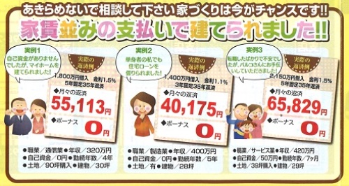 おバカさんです。生涯の大きなリスクを背負ってしまいました。そもそも、多額の住宅ローンを借りること自体が大きなリスクですが・・「貯蓄ができない人」の場合は、「大きなリスク」程度ではなく、「とてつもなく巨大なリスク」になってしまいます。これまで貯蓄ができていないということは、リスク対応能力が著しく低いということです。家計破綻の予備軍が次々と誕生しています。人生を真剣に、慎重に考えよう。生活設計して・・マイホーム取得。 あまちゃん おら、初めてウニを獲った! 八重の桜ゴールデンウイークの時期は、マイホーム関連のCMやチラシ広告で賑わいます。今朝の新聞にも広告チラシが・・。地元住宅会社のものです。戸建住宅の年間着工棟数は、230棟で岩手県2位の会社です。盛んに広告を見る会社です。以下は、その一部・・です。3組とも、ほぼ自己資金ゼロ! ・・です。住宅ローンは35年返済です。固定金利期間は3~5年です。(残期間の30~32年の金利は未定)この方々の人生・・どうなるんでしょう?これまで貯蓄ができなかったから、これからも貯蓄ができません。したがって・・繰上返済ができないから、当初設定どおり・・35年の長期間、ひたすら返済を続けます。現在の年齢が書かれていないので具体的には分かりませんが、完済予定は70歳前後(ブルッ 恐い!)ではないでしょうか?定年後もだいじょうぶ?その前に・・35年経過するかなり前に・・設備の取り換えや、建物のリフォームなどが、必ず必要になります。貯蓄できない人が、それらのお金を準備できる?心配になります。それよりも何よりも・・もっともっと手前の数年後に・・(3年後とか5年後に)大変なリスクが待ち構えています。『返済額を安く見せるため』・・に、住宅ローンの固定金利期間が短く設定されています。(住宅会社にだまされないよーに)現在の返済額が一生続く・・というつもりでいたら、大間違いです。(住宅会社にだまされないよーに)3年後とか5年後の市場金利次第では、早くも家計破綻!・・なんてこともありえます。デフレ脱却を目指して、アベノミクスが動き出しました。普通に受け取れば・・金利上昇圧力が高まっています。普通に考えれば・・3年後とか5年後の市場金利は上昇する・・と思われます。普通に考えれば・・当初の返済額のままで行けるわけがありません。普通に考えれば・・返済額は近い将来アップします。貯蓄ができなかった人は、環境変化に対応できない可能性が高く、破綻!もあり得ます。自己資金が無い人は、もっと謙虚になりましょう。自己資金が無いのに住宅取得するのは暴挙!だと認識しましょう。マイホームが欲しかったら・・まず、お金を貯める練習をしましょう。家賃を払いながらいくら貯められるか。住宅会社にだまされないよーに。住宅ローンの返済額は、年間着工棟数が限られている住宅会社・・の方が、安くなる。 (当たり前)この住宅会社のように、年間実績230棟なんていうところは、営業マンなど・・建築工事に直接かかわらない人数が多い・・です。(人件費が多い・・ということ)今回のように広告チラシもけっこう頻繁に目につきます。(広告宣伝費がかかる・・ということ)それらの経費が余分にかかるので当然、建築費は高くなります。(当たり前)よく目につく、よく耳にする、そんな住宅会社ほど、建築費が高いと思ってまちがいありません。(当たり前)どれくらい高いか?数百万円・・レベルです。以前・・当事務所の顧問会員のプレゼンコンペに参加してもらったことがありますが、同じ図面で5社に見積もり依頼した結果、突出して高かった・・です。35坪程度の家で、最高額と最低額の差が400万円・・ほどで、最高額がこの住宅会社。なので、上記の3つの例の30坪程度の家なら、他の業者を含めてきちんと比較検討すれば、あと300万円ほど安く建てられると思われます。とすれば・・住宅ローンの借入額が300万円ほど減ります。(当たり前)その300万円分、返済額が安くなります。金利1.5%なら、返済額は9,186円/月・・安くなります。融資300万円に相当する利息負担(857,710円)・・も減ります。合計で約385万円も少なくて済む。人生のリスクがかなり軽減されます。なので、大手メーカーで建ててはいけない。あるいは地元業者であっても、着工棟数の多いところで建ててはいけない。今回のチラシには写真付きで、何人かの新築入居者が登場しています。良かった・・とか、感謝・・とかの言葉がたくさん飛び交っています。残念ながら・・この方々は、「数百万円の大損」には、一生気づくことがありません。・自己資金がないのであれば、 住宅取得をしてはいけない。・営業マンが多い、広告が多い、 そんな業者で建ててはいけない。家計改善したい? きちんと生活設計したい?なら・・(できるだけ)1 生命保険に加入しない!2 借金をしない!3 経費を払わない!これだけでいい。すごく かんたん。見違える人生になる。おバカさんの行動指針。『他の人と同じ