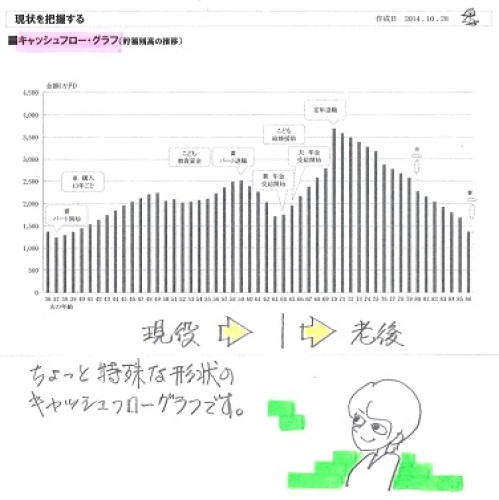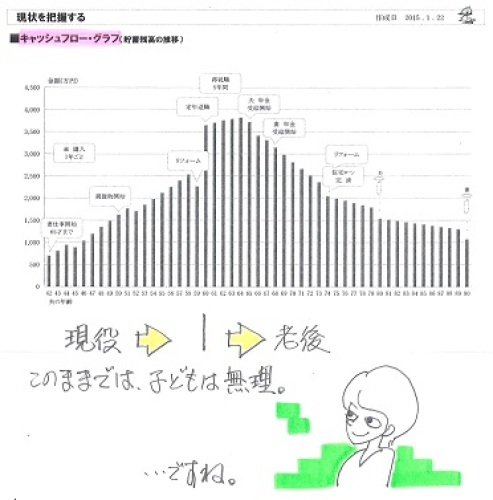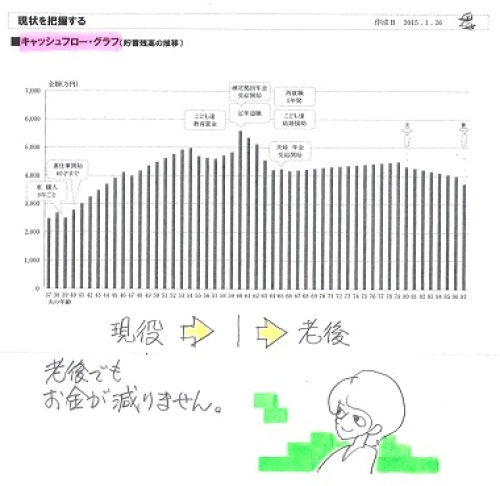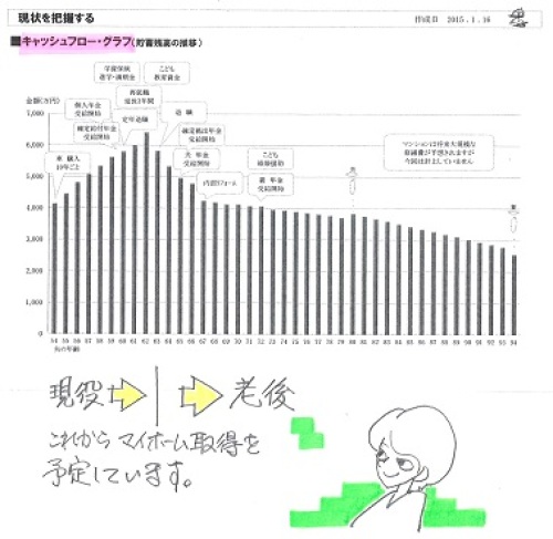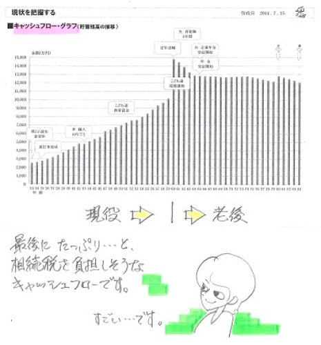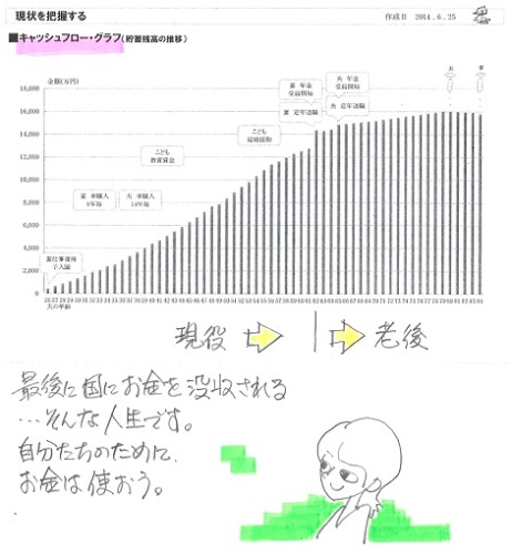 両方やってください・・ということのようです。自分の頭で考える・・生活設計。 〇メール顧問会員のKさん(30代) (相談:ライフプランニング)2014.7.15、現状診断 終了。 現状診断時点のキャッシュフロー。K家の概要。 家族:4人。 30代会社員(教育系)の夫、 30代会社員の妻、 幼児、 赤ちゃん。 希望:マイホーム。 第3子。 住まい:賃貸(家賃:15万円/月) 収入: 夫 793万円/年。 (手取り:632万円/年) 妻 450万円/年。 (手取り:347万円/年) 貯蓄:2,362万円。 (素晴らしい♪) 負債:なし。 (素晴らしい♪)生命保険料:73.2万円/年 終身保険1本、定期保険2本。 おバカさんです。(失礼!) 死亡保障必要額: 現時点 10年後 夫 -6,738万円 -9,586万円 妻 -18,553万円 -18,259万円 金額は、必要資金から手当可能資金を 引いた結果なので、 -(マイナス)は不要ということで、 夫婦ともに現在も将来もまったく不要! 幼児と赤ちゃんがいても不要! 健全な家計なら、普通なことです。 (保険屋さんに だまされないように)ピンクの線が「死亡保障必要額」の推移。 夫婦ともに、現在も将来も不要。本日(2015.1.23)、生活設計シミュレーションの資料作成作業に着手しました。大変長らくお待たせしました。ま・・今日は、ほとんど、着手しただけ ・・ですが。お楽しみに・・。ん・・? 住宅取得シミュレーション、ページが2つもあります。新築 ・・と、中古。両方、シミュレーションしてくれ・・ということ? のようです。それから・・不要な生命保険はどうなったでしょうか?このまま継続すれば、生命保険料は総額で1,373万円も払うことになります。(現状診断12ページ) 【 業務日記:行列のできるFP事務所 】 【 佐々木FP 】《 事務所会計作業 》《 現状診断 》1 Yさん(40代):回答待ち。(1/31着)2 Kさん(40代):回答待ち。(3/27着)3 Kさん(20代):10/2回答待ち。(6/25着)4 Oさん(30代):11/25回答待ち。(9/10着)5 Hさん(30代):今日の作業。(9/19着) ※終了予定は1/26(月)です。 お楽しみに・・。6 Yさん(40代):12/24回答待ち。(9/22着)7 Yさん(40代):12/29回答待ち。(10/10着)8 Hさん(40代):1/9回答待ち。(10/25着)9 Kさん(20代):1/14回答待ち。(11/4着)10 Kさん(30代):11/25依頼着。11 Iさん(30代):11/28依頼着。12 Yさん(30代):12/18依頼着。13 Jさん(30代):1/15依頼着。14 Dさん(40代):1/18依頼着。【 武田FP 】《 ブログ記事で情報発信 》《 顧問会員の実行支援作業 》〇顧問会員のTさん(30代):マイホーム取得 ※マイホーム取得シミュレーション。 ※大きな土地から80坪ほど分割して 購入しようとしています。〇顧問会員のMさん(50代):マイホーム取得 ※土地を購入してマイホーム建築。《 生活設計シミュレーション 》 1 Sさん(30代):住宅取得。回答待ち。(4/3着)2 Kさん(40代):12/19回答待ち。(11/28着) 第1子誕生・住宅取得3 Kさん(30代):今日の作業。(12/5着) 第3子誕生・住宅取得 (1/14データ 差し替え) ⇒ 今日の記事。 ・・っと。《 質問希望? 》 ブログ右「キーワード検索」をどうぞ。 「キーワード検索」に言葉 ⇒ 「このブログ内」 ⇒ 「検索」。 《 セミナー講師? 》 2時間3万円(+税・交通費)。 銀行・保険・住宅会社等に振り回されない生活設計。 消費者側に立った内容の講演。 講師をお受けします。《 顧問会員希望? 》 「顧問会員って何?」で支援内容や当事務所との関係を確認の上、右記へfpst@axel.ocn.ne.jp