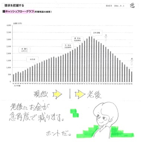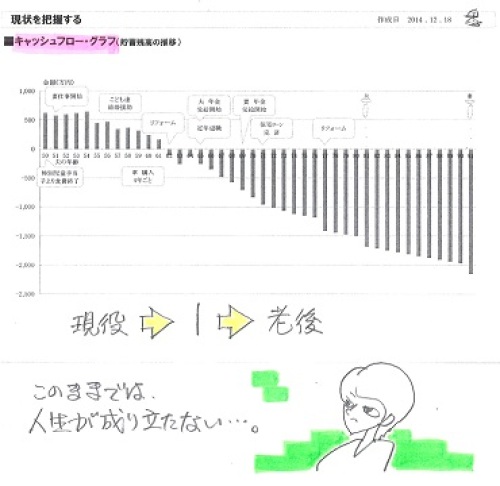 作成しようとしましたが・・。自分の頭で考える生活設計。〇メール顧問会員のKさん(40代) (相談:ライフプランニング)2014.9.1 ・・に、現状診断終了。シミュレーション作成のため、行列に並んでいました。 1 第1子誕生 2 マイホーム建築K家の概要。 家族:2人。 40代自営業の夫、 30代専業主婦の妻、住まい:賃貸。 家賃5万円。 収入: 夫 392万円/年。 (手取り:256万円/年) 貯蓄: 475万円。 負債: 無し。生命保険料: 0万円/年。死亡保障必要額: (万円) 現時点 8年後 15年後 夫 1,197 830 70 (639) 妻 -3,401 -3,031 必要額は、「遺族の必要資金総額」から 「手当可能資金」を引いて算出します。 なので、-(マイナス)は不要ということで、 妻は現在も将来もまったく不要! 夫は必要・・という結果になっています。生活設計シミュレーション。本日より作業着手しましたが、入り口部分で立ち往生してしまいました。なぜか・・?依頼された内容は・・第1子誕生とマイホーム建築ですが、その第1子誕生で・・シートに記入された内容の通りの「こども費」総額を算数すると、1,626万円になります。で・・キャッシュフロー表を見ると、人生最後の貯蓄残高は746万円・・です。つまり・・現状の収支のままの人生では、第1子が誕生すると、880万円ほどお金が足りなくなります。(上記のグラフからも分かる)なので、このままシミュレーション資料を作成すると、悲惨なキャッシュフローグラフができ上がってしまいます。「マイホーム取得」のシミュレーションでは、生涯賃貸の場合の「住居費総額」が住宅取得後の「住居費総額」に置き換わるだけなので、それほど人生に大きな負荷がかかることはありませんが・・「子ども誕生」のシミュレーションでは、子ども1人分の負荷が(何かに置き換わるわけでもなく)そのままストレートに上乗せになります。なので、あらかじめの算数が必要です。自分の今のキャッシュフローで、「子ども費」1人分が賄いきれるか?あらかじめの算数をしてからかかりたい。ただし、子ども費の減額を考える前に、現在のキャッシュフローをいじりたい。改善の余地は無いか?あと800万円とか、1,000万円とか、改善の余地は無いか?夫婦で真剣に考えてみましょう。キャッシュフロー表をいじって、改善できたら、添付して送ってください。その回答を得てから、あらためて作業着手します。よろしく、お願いします。880万円足りない ・・っと。《 質問希望? 》 ブログ右「キーワード検索」をどうぞ。 「キーワード検索」に言葉 ⇒ 「このブログ内」 ⇒ 「検索」。 《 セミナー講師? 》 2時間3万円(+税・交通費)。 銀行・保険・住宅会社等に振り回されない生活設計。 消費者側に立った内容の講演。 講師をお受けします。《 顧問会員希望? 》 「顧問会員って何?」で支援内容や当事務所との関係を確認の上、右記へfpst@axel.ocn.ne.jp