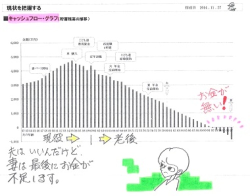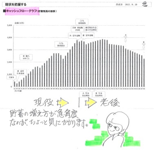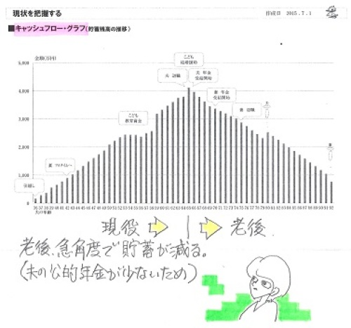 必要額が将来も同じなら四角形。必要額が徐々に減るなら三角形。必要額が無いなら、加入しない。健全な家計なら3番になる。生命保険は不要!・・と、なる。自分の頭で考える生活設計。〇メール顧問会員のHさん(30代) (相談:ライフプランニング)2015.7.1 に、現状診断が終了。2015.9.9 に、第2子誕生シミュレーションが終了。メールをいただきました。おはようございます。昨日は第二子シュミレーションありがとうございました。こんな時間にすみません!! ※朝の5時7分のメールです。(子供と一緒に寝ていまい 早く目覚めてしまいました 笑) ※別にだいじょうぶです。 電話だったら迷惑ですが・・。早速なのですが、保険加入の件でご相談があります。前回シュミレーション結果では、我が家は10年後も同額の保障が必要とのことでしたが ※同額・・というよりも、 必要額が将来に向けて 増えていく・・という、 不思議な結果になりました。 死亡保障必要額: 現時点 10年後 夫 4,011万円 4,471万円 妻 -3,305万円 -2,364万円今回、10年後も実家に戻る…を選択した場合、必要額が減っていて、この状況でも4角形の保険が必要なのか?の疑問があります。 ※今回、本人が自分で シミュレーションしたのが、 以下です。 死亡保障必要額: 現時点 10年後 20年後 23年後 24年後 夫 3,595 1,574 591 181 -183 妻-3,305-2,364 ※必要額が徐々に減ります。 三角形の保障が適当です。ただ、遺族年金が少ない我が家の場合、預貯金が確実にシュミレーション通りに出来ているところがポイントになるのではないかと思います。 ※そんなことは、 だれの場合でも同じこと。預貯金がこの通りでなかった場合は、4角形が延々必要になりそうですよね。。 ※「預貯金がこの通りでなかった場合」 は、 死亡保障必要額だけでなく、 人生そのものが成り立ちません。 「この通りでなかった場合」 を想定していたら、 生活設計ができません。 キャッシュフロー表を作る意味 ・・自体が無くなる。主人の法人化(話合いましたが 今のところ積極的ではなさそう)や両親との同居(購入なのか賃貸なのか)と先行きはまだ確定ではありませんが、現時点で私の思いとしましては1、収入保障保険のような 3角形の保険に入る (総額3500万60才まで) 2、現在まだ妊娠はしていませんが (いつするか分からない)、 第2子を見据えた金額で一旦加入し、 恵まれなかった場合に (あと2年くらい頑張る?) 1子に必要な分だけに減額する (保険屋さんに2年分 プレゼントになりますが、、) ※「3角形の保険(3500万60才まで)」 という設定が、今回導き出された 「第2子を含めた死亡保障必要額」 です。 それでOKです。保険加入に関して少しだけ心配事が、、主人のコレステロールと尿酸値の数値が高く、現時点ではそう問題ではない(健康体割引は使えないかも。。)のですが、もし定期保険にしていて再度10年後に入りなおす場合、保険加入できるのか?の心配があります。上記のシュミレーションを自分でも作成してみたので、もしよろしければ見てやってください。 ※「3角形の保険(3500万60才まで)」 で、OKです。(黄色セルは前回のコメント欄が反映 されていなかったものを少し修正しました)最後にもう1点、先日の記事で小規模企業共済の事について書かれており、我が家も以前検討した時期がございまして、実はすごく気になっています。仮に24万年間でシュミレーションをしてみたのですが節税効果はありますが我が家の場合老後へ資金を送ってしまい、結局いつまでも生命保険が必要になりそうな気がしますが、やはり検討の余地もないでしょうか? ※小規模企業共済は基本的に 払った分を将来受け取る制度です。 所得控除というメリットを受けながら。 現役のお金を老後へ送る作業です。 それだけのことです。 確定拠出年金も同様です。 現役のお金を老後へ送る作業です。 (金融業界を潤してあげながら) それだけのことです。 それよりも、厚生年金保険です。 ・・何度でもいいますが。 自営業の方のキャッシュフローを 眺めてみていつも思うのは・・ 「老後のお金が急角度で減って不安」 ということです。 厚生年金に加入していれば、 老後不安は大幅に解消されるし、 死亡の際の保障も手厚くなり、 障害者になった際の保障も 手厚くなり、本当に安心です。支離滅裂な文章になりすみません!!そして長々とすみません。よろしくお願いいたします。雨ばかりで嫌になりますね、お体ご慈愛くださいませ。 ※岩手はあまり雨は降っていません。これが現状診断時点のキャッシュフロー。自営業の人の特徴・・です。公的年金が少ないために・・老後のお金が急角度で減ります。で・・こちらが、今回の第2子誕生後のキャッシュフローです。《 H家の概要 》 ・・現状診断時点家族:3人。 30代自営業の夫、 30代会社員の妻、 赤ちゃん。 相談:保険、マイホーム、第2子。 住まい:賃貸(家賃:9万円/月) 収入: 夫 ----万円/年。 (手取り:431万円/年) 妻 ----万円/年。 (手取り:120万円/年) 貯蓄:100万円。 負債:な