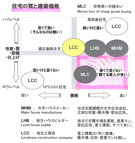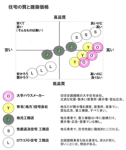 ロウコスト住宅は・・もちろん、対象外にしましょう。低価格には理由がある。自分の頭で考える生活設計。〇メール顧問会員のOさん(30代) (相談:ライフプランニング)2015.9.10 現状診断・・終了。メールをいただきました。こんにちは。さっそくヒアリングシートを書き込んだのでよろしくお願いいたします。 ※今度は生活設計の ヒアリングシートです。また、年金の追納制度を明日、年金事務所に行ってお願いしてこようと思います。武田様のブログに出会い今後のことを以前より考えられるようになりほんとうによかったと思います。ありがとうございます。 ブログでマイホーム購入は1 目が肥えた状態作り。2 ぎりぎりまで比較検討と書いてあるため土地、マイホーム購入はできたら2年ほど勉強して叶えていきたいと思っています。 ※はい、それがいいです。 まったくの素人のまま 突っ走って住宅取得すると、 以後の人生はマイナスからの スタートになります。 たとえばマイナス500万円 からのスタートに・・。 きちんと生活設計したければ、 マイナスからのスタートは してはいけません。そこで現在旦那とインターネットで工務店を調べたり住宅展示場や完成見学会等まわったりしています。話をいろいろ聞いていると専門的な知識をたくさん伝えられ頭の中がパンクしてしまうことがありますがめげずに頑張っていこうと思います。 ※2シーズンも勉強していれば、 今日ちんぷんかんぷんだった ことが、意外に簡単に 分かるようになります。 それからです、住宅取得は。そこで武田様にひとつお聞きしたいことがあります。経費が高い住宅会社というのはブログを読んでそこでは死んでも建てないと誓っています。 ※大手ハウスメーカーや、 地元でも着工数が多い 住宅会社のことです。しかし適正価格の住宅会社がいまいちピンときません。この適正価格の住宅会社のなかにローコスト住宅をうたっている住宅会社は入れても良いものなのでしょうか。 ※一定レベルを確保した上での 「適正価格」住宅を探ります。 ロウコスト住宅は、 見える部分、見えない部分で、 ひたすら安くするために、 レベルダウンを積み重ねて 考えられた住宅です。 こんなものは、検討対象外! 坪単価の安さを売りにする 業者を信用してはいけない。実は〇〇の住宅会社を調べていたところ〇〇という会社が出てきて見学に行ってみようか迷っています。 ※迷うことはない。無駄なお金をたれ流すのもばからしいと思っておりローコストであればうれしいが大切なものまで削っていたらもともこうもないので信用できず・・・。 ※「安くて良い住宅」は無い。 安さには、それなりの理由がある。 「高くて良くない住宅」は、 ど素人の消費者が よく建てているが・・。 (大手ハウスメーカーや地元の 有名住宅会社に奨められて・・)適正かどうかというのは最終的に見積もりを出してもらわないと分からないものなのでしょうか。 ※当たり前。 このへんは、一言で説明 できないことなので、 おいおい説明をくり返しながら、 整理整頓したものを トップページに掲載する つもりです。何を言っているか分からなかったらすみません・・・。 ※だいじょうぶ。 ちゃんと伝わっています。※ちょっと、絵を作ってみました。上下は住宅の質、左右は建築価格です。上にいくほど質が良く、右へ行くほど価格が高くなります。全体を4つのマスに分けた場合・・下の2つは対象外にしたい。左下のロウコスト住宅はもちろんだが、右下は最悪!、ここで建ててはいけない。何といっても、質が悪いのに価格が高い。初めて展示場へ行って、即断して契約した人たちは、だいたいこの枠内で建てている。人生・・マイナスからのスタート。あるいは、右下でなくても、大手ハウスメーカー等で建てれば、「適正価格」の住宅よりもたとえば500万円も高い買い物になる。同じ質・レベルの建物なのに、500万円もマイナスからのスタートになる。地元工務店3~5社できちんと最後の最後まで(契約直前まで)比較検討すれば、「適正価格」がどのへんなのかは、はっきり見えてくる。A社 : 2,150万円B社 : 1,960万円C社 : 2,190万円D社 : 2,380万円E社 : 2,200万円・・のように見積もりが出そろった場合、(最大価格差400万円強だが、 これが普通、当たり前のこと、 地元工務店同士でもこうなる)「ははあ・・今回の我が家の場合、 適正価格は2,100万円台後半 あたりなんだな・・。 で・・B社はかなりがんばって きたんだな。 B社で行きたいところだけど、 見積もり落ちとか無いか? きちんと見積書をチェックしよう。 それから・・なお分からない 部分はしっかり確認しよう。」・・のように、自分の頭で考えよう。ということは、まったくの素人では無理だということ。だから、2シーズン勉強しよう・・と言っている。(できれば、セミプロレベルまで)自分の頭で考えてマイホーム取得ができる、そんなレベルまで行ければ、以後の人生をマイナスからスタートすることは