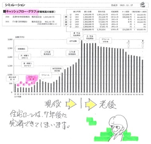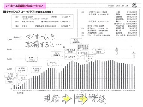 一条工務店とは長い闘いでしたが、やっと、ケリがつきました。素人がプロを敵に回してよくがんばった! 素晴らしい!自分の頭で考える生活設計。〇メール顧問会員のKさん(30代) (相談:ライフプランニング)2015.12.17、現状診断が終了しました。 一条工務店に「仮契約」と言われてしてしまった契約の解約はもちろん、払った契約金を取り返そうと奮闘していました。この写真の過去記事参照。メールをいただきました。御世話になります。生活設計の依頼です。マイホーム取得を目指して、家計がどうなるか診断してだたきたいと存じます。 ※住宅ローンを借りない・・ 現金のみでのマイホーム建築です。 30代で・・ですよ、素晴らしい♪ キャッシュフロー表を作ってみたから、 確信を持って計画できます。一条工務店からの返金は全額返金となりました。 ※おっ! やった!! 素晴らしい! よく負けずに戦った! 「仮契約」としてだまされて契約した 契約金が全額返金!・・です。 住宅メーカーの横暴を簡単に 許してはいけない。その節は本当にお世話になりました。 ※終わってみれば、良い人生勉強に なった・・かと思います。 どんな分野にも色々な人間がいる ことも感じたと思います。 こちらの身になってアドバイスして ほしいのに、 他人事みたいだったり、 まったく突き放す感じだったり・・。 消費者の味方のはずの人が、 正義の味方のはずの人が・・。 色々な人で世の中が形成されている。それを反映した現状診断を添付してあります。さらに、診断いただいた結果も合わせて内容をいくつか変更しました。 ※キャッシュフローに余裕があり過ぎ、 「もう少しゆとりのある生活を・・。」 と、コメントしていました。保険を解約して、 ※「保険料(失うお金)」という支出が まったく不要な家計です。おいしいものを食べて、生活費をあげ、子供たちにもかわいい洋服を選ぶことにしました。 ※その調子、その調子・・。ストレスフリーで不安もなく生活できるって本当にいいですね。 ※生涯の状況が見渡せる・・ キャッシュフロー表があるから、 家計すべてに根拠があります。 なので不安も無く、確信を持って・・ 色々なことに対処できます。 「伝家の宝刀」を持つ・・って、 精神衛生上もいい・・んです。吹きぬけのブログも参考になりました。やっぱり、空気の容積は増えるから暖かさの対策が必要ですよね。 ※普通の暖房では・・ 上部空間だけが暖まって、 人がいる床付近は寒いままです。 建物の気密断熱の程度によっては・・ 「下が暖まるのに時間がかかる」 ・・ではなくって、 「暖房しても下は永久に寒い」 ・・などということもあり得ます。見た目はかっこいいですけどね。モデルルーム見てもメンテナンスの観点から「あんな高い所に照明があるけど・・」って心配してしまうようになったり。7月に一条工務店の契約をして1月に契約取消してから ※簡単に言っていますが・・ ここに来るまで夜も寝られないほど、 妻は色々がんばっています。 一条工務店に洗脳されたままの 夫との対決から始まって・・ 色々がんばってきました。本当に、家を見る目が変わりました。 ※で、やっと・・ 「生涯最大の買い物をする」 という認識を前提に、住宅建築を 考えることができるようになりました。いいこともわるいこともあるってことがわかり何を採用しようか、どういう生活が私たちの思考に向いているのか考えつつ、 ※マイホーム取得をしようとする 本当の姿になってきました。 住宅メーカーにお任せではいけない。夫の希望も増えつつ(書斎が欲しいそうです)。平屋が2階だてになりそうな・・・。希望をかなえる家が、予算どおり建つかな?どうかな?と言ったところです。 ※生涯最大の買い物を楽しみましょう。アドバイスが道しるべなり、業者選びの基準の一つになりとてもありがたいです。今後ともよろしくお願いいたします。 ※生活設計依頼を受けました。 本日(1/25)付けで行列に並びます。 《 K家の概要 : 現状診断時点 》家族 : 30代会社員の夫、 30代会社役員の妻、 幼児と赤ちゃん・・の、4人家族。 相談 : マイホーム。 住宅ローン。 住居 : 賃貸。(家賃:6.3万円) 収入 : 夫 年収:584万円 (手取り:463万円) 妻 年収:486万円 (手取り:387万円) 貯蓄 : 1,076万円 借金 : なし。 生命保険料 : 23万円/年 夫:所得補償保険(日立キャピタル) 変額終身保険(ソニー) 子:学資保険(ソニー) 養老保険(ソニー) これらすべて、解約した方がいい。 死亡保障必要額 検証結果 : 現時点 10年後 夫 -9,191万円 -1億1,990万円 妻 -8,046万円 -1億958万円 「必要資金」から「手当可能資金」 を引いた結果なので、 -(マイナス)は不要ということで、 夫婦ともに現在も将来もまったく不要。 1億円前後のマイナスです。 もう・・徹底的に生命保険不要! 幼児と赤ちゃんがいても不要です。 健全な家計なら、当然のことです。 『健全な家計に生命保険不要!』 『だらしない家計に生命保険宿る』 (生命保険は人生の疫病神!) 保険屋さん
