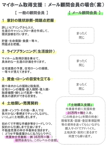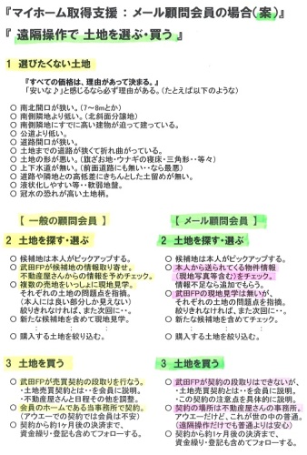メール顧問会員のマイホーム取得。支援してほしいという問い合わせが時々ありますが、 現在は行なっていません。 行なっていませんが・・昨日・・今日・・と、試しに「案」を作ってみています。自分の頭で考える生活設計。まだ確定したことではなく、あくまでも「案」ですが・・『遠隔操作で土地を選ぶ・買う』土地購入について、一般の顧問会員にやってあげていることが、メール顧問会員の場合はどんな感じになるんだろうか・・?考えてみました。もちろん、生活設計後の実行支援として・・です。「生活設計はいいから、土地購入や マイホーム建築だけを、なんとか 面倒を見て頂けないでしょうか?」・・などというお話は、もちろんお断りです。どんどん引き受ければ、ビジネスとしては順調になりますが・・生活設計の作業を通じてできあがった信頼関係に基づいて、各種実行支援を行なっています。当事務所は、ファイナンシャル・プランナー事務所です。生活設計があっての実行支援です。(当たり前)私のライフワークです。字が小さ過ぎて読みにくいですね。スミマセン!遠隔操作で土地購入 ・・っと。〇 商品販売をしない。 〇 しがらみを持たない。誇りをもって、愚直に、 消費者側に立ち続けて15年目の ファイナンシャル・プランナー事務所。《 質問希望? 》 ブログ右「キーワード検索」をどうぞ。 「キーワード検索」に言葉 ⇒ 「このブログ内」 ⇒ 「検索」。《 顧問会員希望? 》 「顧問会員って何?」で支援内容や当事務所との関係を確認の上、右記へfpst@axel.ocn.ne.jpメール顧問会員は、指定した月日のみに受付けます。