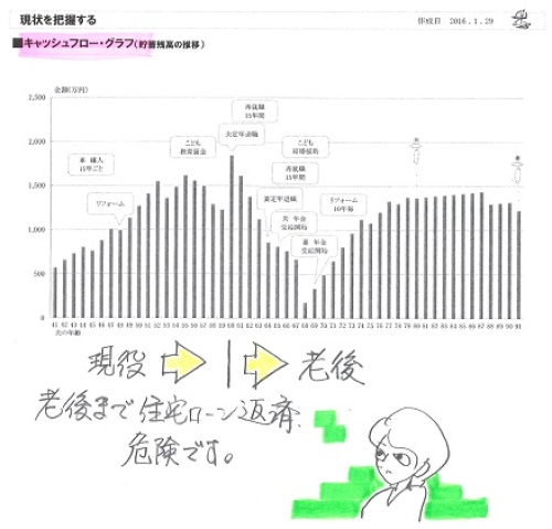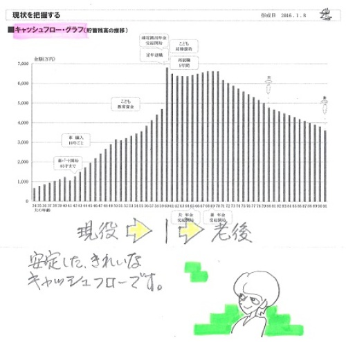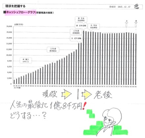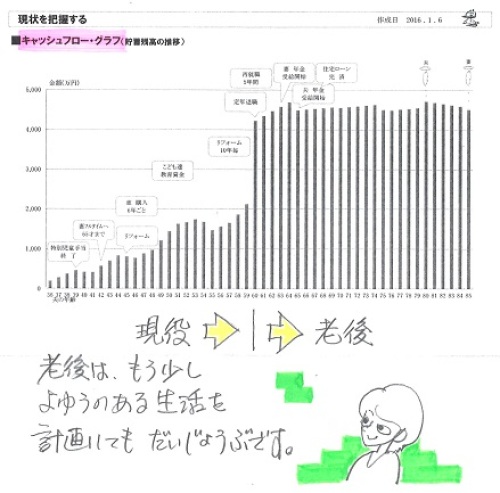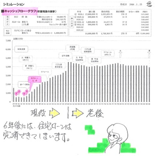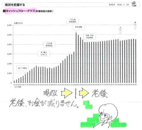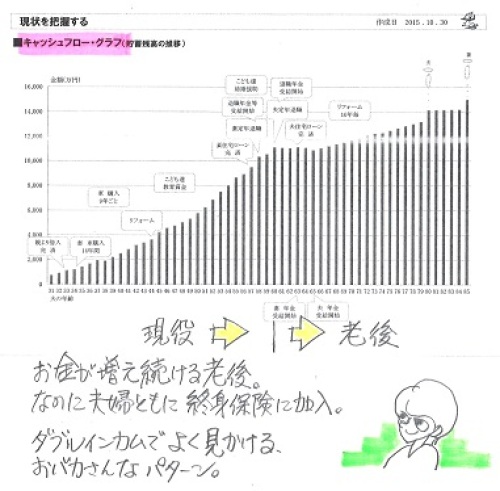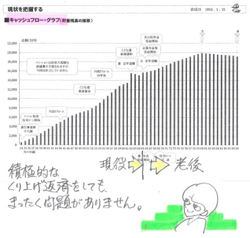 30代のフルタイム・ダブルインカム、今年マンションを購入して・・( マンションを所有してはいけない! まともな価格がつく内に売りたい )40代で住宅ローン完済。50代で現金で2度目の住宅取得。・・なんてことも十分に可能なキャッシュフローです。本日、現状診断 終了!自分の頭で考える生活設計。う・・ よだれが・・ 【 業務日記:行列のできるFP事務所 】 【 佐々木FP 】《 事務所会計作業 》 《 現状診断☆ & 生活設計★ 》1 Mさん(30代):☆11/11再ヒア待ち。(9/28着) ※12/25 回答戻る。 ※今日の作業。 本日より再着手しました。 現状診断終了予定は、1/20です。 お楽しみに・・。2 Iさん(50代):☆1/8再々ヒア待ち。(11/6着) ※1/14 回答戻る。3 東Tさん(30代):☆12/11再ヒア待ち。(11/24着)4 西Tさん(30代):☆12/14再ヒア待ち。(11/24着) ※12/18 回答戻る。 ※今日の作業。 本日、現状診断が終了。 億単位のキャッシュフローに なってしまいました。(久々です) 老後は2億円近い貯蓄残高に・・。 家族は4人。 フルタイムの共稼ぎ夫婦に、 (会社員と公務員) 幼児と赤ちゃんの4人家族。 この家族状況から・・ 夫婦ともに死亡保障は不要な ことが分かります。 幼児や赤ちゃんがいても、 夫婦ともに現在も将来も 生命保険は不要です。 生命保険料・・という支出が まったく不要な健全な家計です。 フルタイムの共稼ぎでありながら、 保険屋さんの言いなりで、 生命保険に大量加入している 夫婦がかなりいますが・・ はっきり言います、おバカさんです。 目を覚まそう! マイホームに関して・・ 新規に顧問会員になるころには、 すでにマンション購入を決定済み。 (手遅れ!でアドバイスできず) 住宅ローンの返済期間は 35年返済か20年返済か・・で 迷ったようですが・・ 夫婦の一方の収入で返せる 返済額にした方がいいので、 35年返済を推奨。 生活設計の観点からは・・ 『住宅ローンは長く借りて短く返せ』 余裕のある返済額で毎月貯蓄して、 積極的に繰上返済しましょう ・・ということです。 教育資金がかかる時期は、 キャッシュフローで充分過ぎる 貯蓄残高が積みあがります。 何の心配も無く積極的な繰上返済 をくり返してだいじょうぶ・・です。 ・・のような判断も、 キャッシュフロー表を作ったから、 確信を持ってすることができます。 積極的な繰上返済で・・ 40代で完済できてしまいそうです。 なお・・ 団信には加入しないで、 収入保障保険に加入しようと していましたが、それさえ不要です。 キャッシュフローグラフを見れば、 50代には2度目のマイホーム取得が できそうです。 それも借金せずに現金で。 住宅ローン無しのマイホーム建築、 なかなかいいもんですよ・・。 (経験者:武田FP談) メール添付で送りました。5 Sさん(30代):★12/1生活設計 依頼着。6 Sさん(40代):☆12/3現状診断 依頼着。7 Nさん(30代):☆12/10現状診断 依頼着。8 Dさん(40代):★12/10生活設計 依頼着。9 Kさん(30代):☆12/14現状診断 面談ヒア。10 Mさん(30代):☆12/19 現状診断 依頼着。11 Iさん(30代)12月:☆12/29 現状診断 依頼着。12 Iさん(30代)10月:☆12/31 現状診断 依頼着。13 Uさん(40代):☆1/8 現状診断 依頼着。14 Iさん(30代):★1/12 生活設計 依頼着。 ・・っと。〇 商品販売をしない。 〇 しがらみを持たない。誇りをもって、愚直に、 消費者側に立ち続けて15年目の ファイナンシャル・プランナー事務所。《 質問希望? 》 ブログ右「キーワード検索」をどうぞ。 「キーワード検索」に言葉 ⇒ 「このブログ内」 ⇒ 「検索」。《 顧問会員希望? 》 「顧問会員って何?」で支援内容や当事務所との関係を確認の上、右記へfpst@axel.ocn.ne.jpメール顧問会員は、指定した月日のみに受付けます。