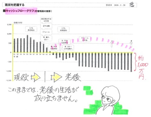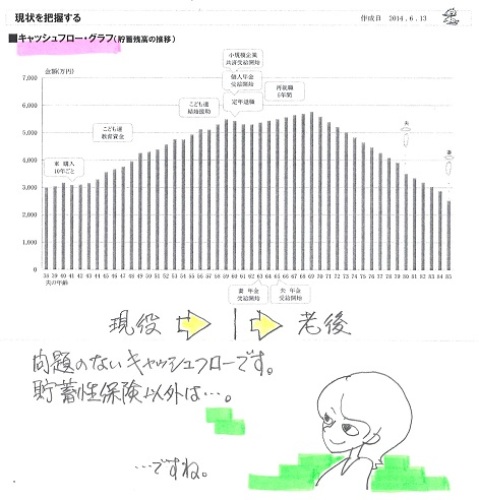 我が家の一生のお金の動きが一目で分かるって素晴らしいです。将来の見通しがたつということがこんなにも安心するものなんだと実感しています。これから何をするにも確信を持って生きていけそうです。自分の頭で考える生活設計。〇メール顧問会員のMさん(30代) (相談:ライフプランニング)2016.1.19(火)、現状診断・・終了。だらしない家計に 生命保険が宿る★メールをいただきました。現状診断受けとりました。どうもありがとうございました。現時点では貯蓄が少ないため、人生が成り立たないんじゃないだろうかと診断が終わるまでとても不安でしたが、なんと老後も貯蓄が減らないという予想外なキャッシュフローで驚きました。各支出設定はを何度も考えて直して出たものですが、支出の設定が少な過ぎるとコメントされてしまいました。う~ん、難しいですね。とはいえ、数年前にソニー生命のプランナーにつくってもらったものとは信頼度が比べ物にならないです。 ※当たり前です。業務が違うから。 保険屋さんは、保険を売るのが仕事。 当事務所は、生活設計が仕事。 ライフプランニングの次元が違う。我が家の一生のお金の動きが一目で分かるって素晴らしいです。 ※それが、ライフプランニング。将来の見通しがたつということがこんなにも安心するものなんだと実感しています。 ※それが、ライフプランニング。これから何をするにも確信を持って生きていけそうです。 ※キャッシュフロー表を根拠に、 何をするにも確信を持って、 考え、判断し、行動することが できます。これからじっくり読み込んでいって、伝家の宝刀にしたいと思います。 ※使いこなせないと・・ 「宝刀」にはなりません。 どんどんいじったり、 試したりしてみましょう。またマイホームのシミュレーションをお願いすると思いますが、どうぞよろしくお願いします。その前に会員の期限が切れそうですね。延長するにはどのようにしたらいいでしょうか? ※会員期限が切れても・・ 相談だけなら、いつまでも対応 しますが、 資料作成を希望するのであれば、 更新してもらう必要があります。 2年目の年間顧問料を頂きます。 同じく36,000円です。《 M家の概要 : 現状診断時点 》家族 : 30代教員の夫、 30代専業主婦(後・・パート)の妻、 幼児、幼児、赤ちゃん・・の、5人家族。 相談 : マイホーム。保険。住居 : 賃貸。(家賃:6.7万円) 収入 : 年収566万円 (手取り455万円) 貯蓄 : 117万円 借金 : なし。 生命保険料 : 3.9万円/年 夫:収入保障保険(アクサダイレクト) これ、解約した方がいい。 継続すると、計92万円を失う。 『保険加入=お金を失うこと!』 死亡保障必要額 検証結果 : 現時点 10年後 夫 -1,061万円 -2,402万円 妻 -8,299万円 -6,604万円 「必要資金」から「手当可能資金」 を引いた結果なので、 -(マイナス)は不要ということで、 夫婦ともに現在も将来もまったく不要。 幼児や赤ちゃんがいても不要です。 健全な家計なら、当然のことです。 『健全な家計に生命保険は不要!』 『だらしない家計に生命保険が宿る』 (生命保険は人生の疫病神!) 保険屋さんにだまされないように・・。これからは確信を持って ・・っと。〇 商品販売をしない。 〇 しがらみを持たない。誇りをもって、愚直に、 消費者側に立ち続けて15年目の ファイナンシャル・プランナー事務所。《 質問希望? 》 ブログ右「キーワード検索」をどうぞ。 「キーワード検索」に言葉 ⇒ 「このブログ内」 ⇒ 「検索」。《 顧問会員希望? 》 「顧問会員って何?」で支援内容や当事務所との関係を確認の上、右記へfpst@axel.ocn.ne.jpメール顧問会員は、指定した月日のみに受付けます。