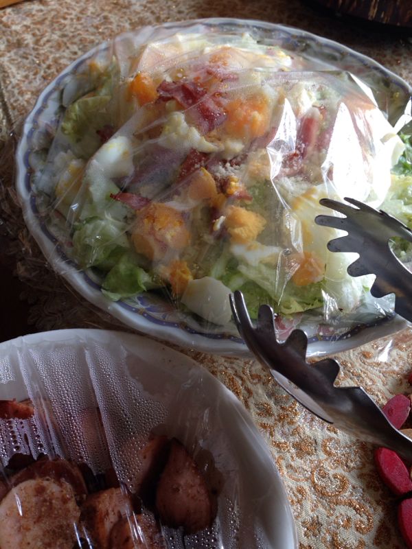手が空いている私は 息子のお昼ご飯を、作る。 シーザーサラダ 魚肉ソーセージを、マヨネーズで焼いたもの 麻婆豆腐もインスタントを利用して。 お肉も焼かなくては… ラップかかったままだけど(笑) まぁ、ゆるせ(笑)
