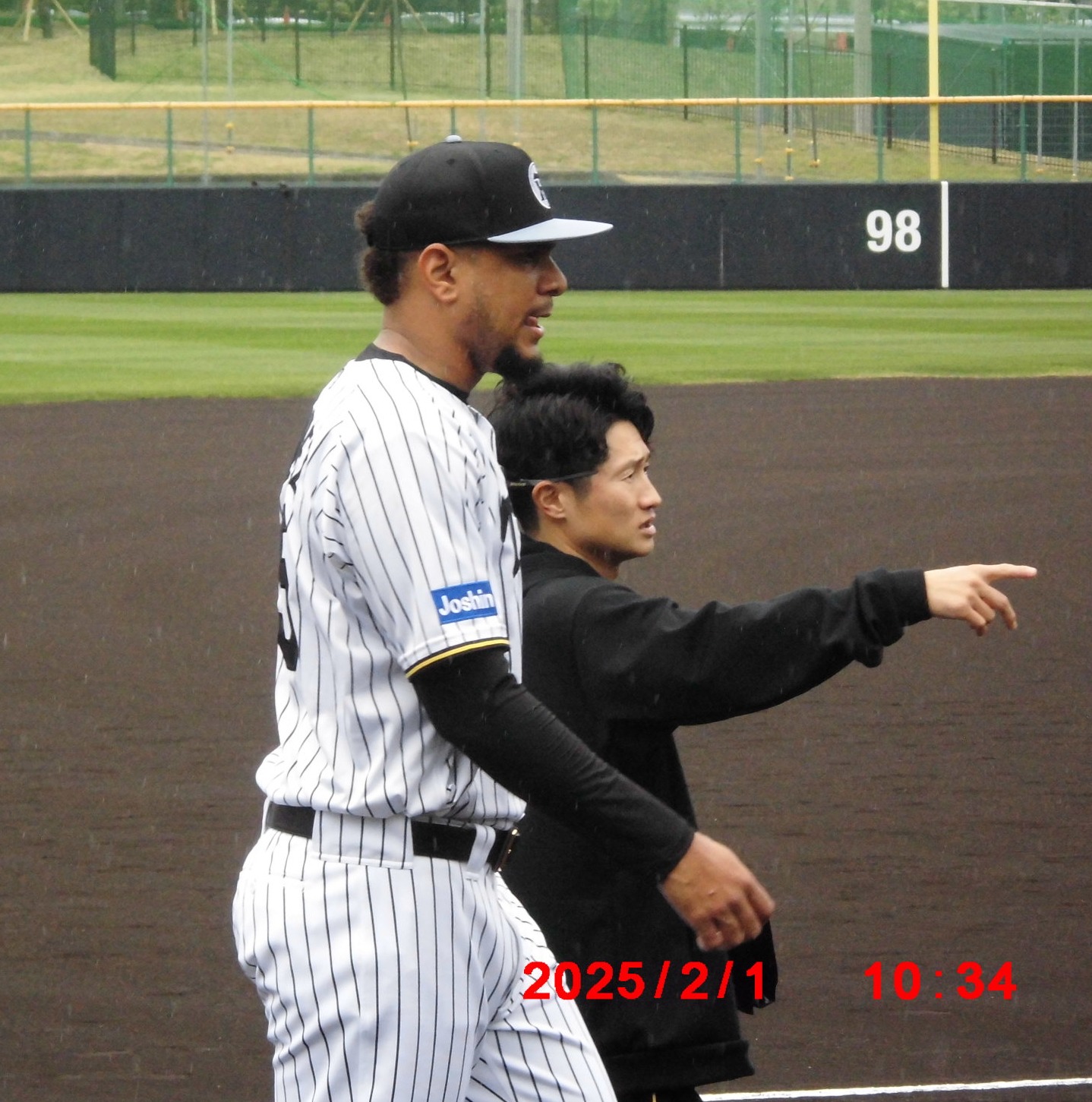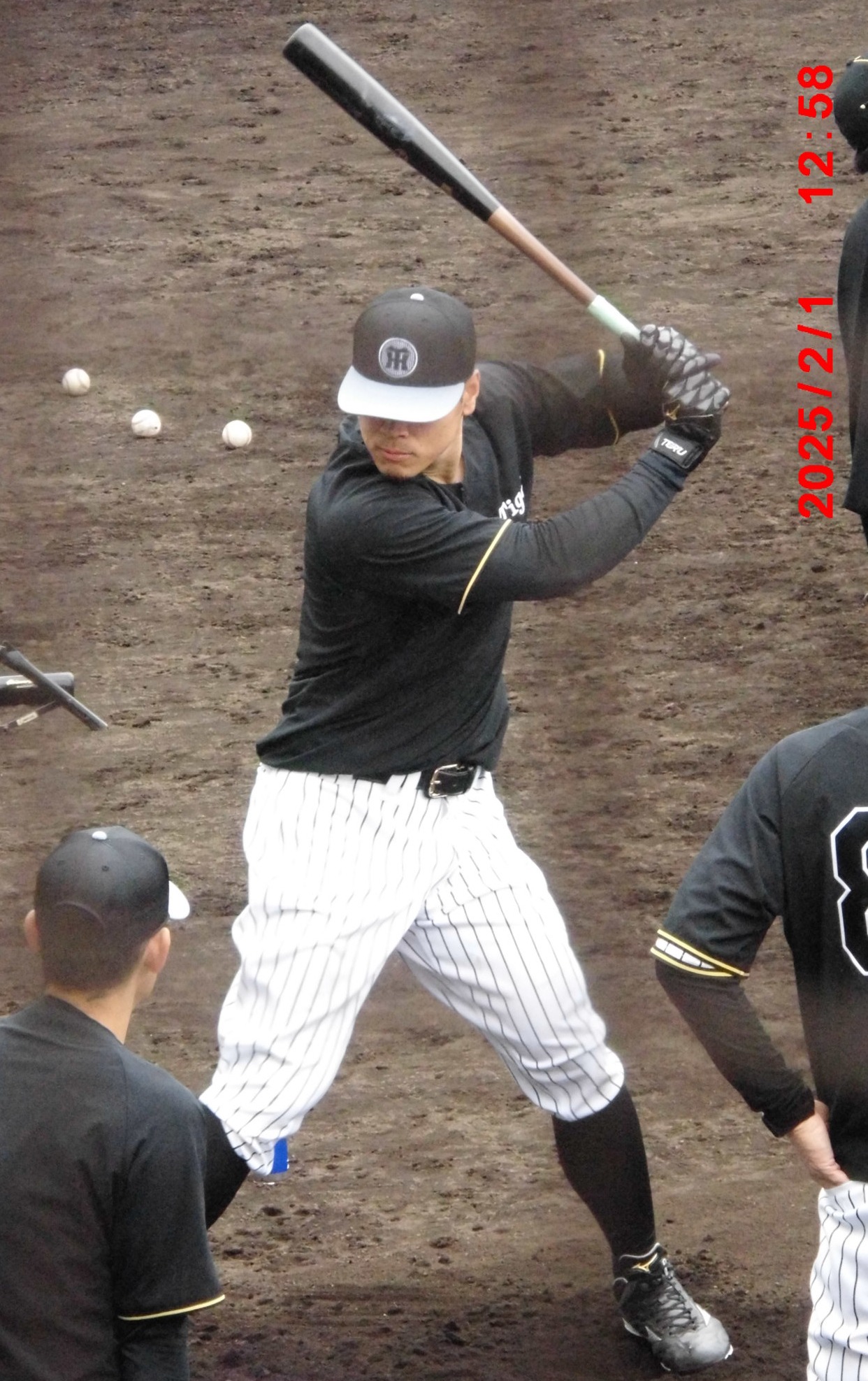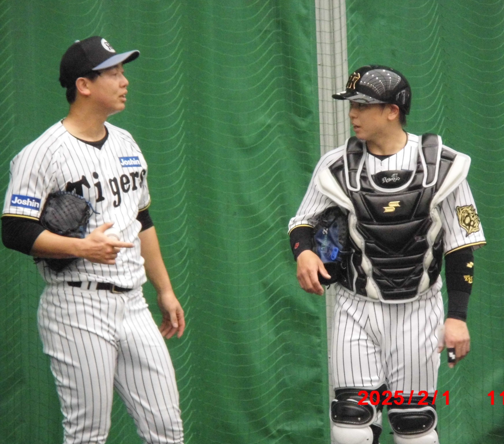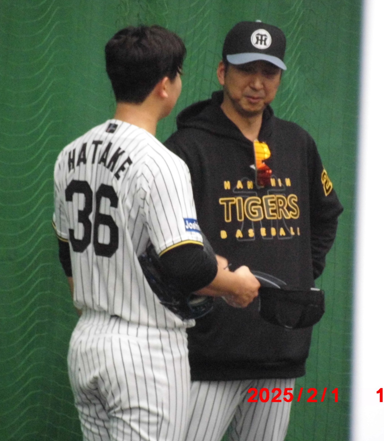 梅ちゃんと畠選手          居残り練習にひょっこり登場、球児監督