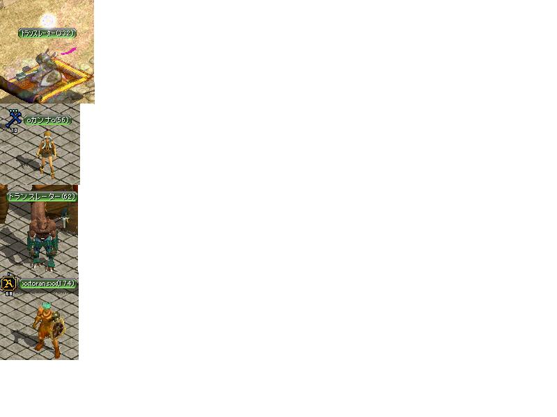 お鱧ーございます!トランスレーターことドラゴンレーダーです^w^(Gメンにつけられた(笑))この2連休もはっきりいってなんもしてないんですがwブリーチばっかみてました^^暇なんで、今半分ぐらいってとこかな。ブリーチのアニメはBGMが俺は好きです、会ってるようなきがする。さてほとんどRSやってないんで、ネタないので。GVでも書くか相手さんは9時代ということで少なめな感じはしました。でも相手のDTさん強烈ですね、抵抗MAXでも30ダメ食らってましたから。相手のBISさん俺とほとんど同じlvですが、俺が健康になるより絶対堅いってぐらいの堅さでした。恐ろしいwWIZが1だった訳ですが、そのWIZさんがうまいし固かったです。え?俺?心臓ホリクロとかやって遊んでました^w^相手のtop剣士さんに普通に殺されました^w^やっぱ天使だときついですね、ちょっとでも卵のタイミング逃すと逝けます。これでもHP4500あるんだけどなぁ、健康の時の半分です^w^アスヒに頼りすぎてるって感じがありました。たぶん3回死んで、俺は2回しか確認してないですけど、4回は倒してたみたいなんで、+ですね^^結果オーライwじゃ済まされませんね^^;by the way気づきましたか?俺が343になってるのをw実は休止って決めた後に2倍ありましたよね?あれでやることなかったので、日曜にptできた13時から遺跡内周に入って・・・・22時までずっとptにいました^w^で、340になってスウェブ3回行って343になりました。でももう課金切れたのでGVのみになります。暇なんでPC前の生活は変わらないと思いますが、チャットストーンと楽しみたいと思います。じゃぁノ!