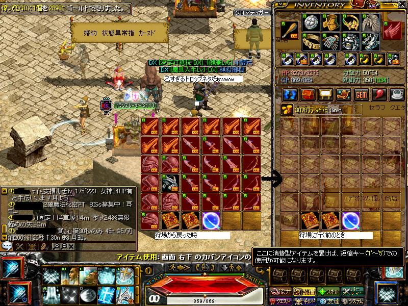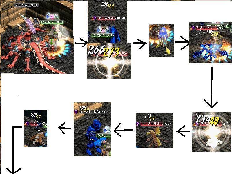 こんにちは!いつもソロしてる塔地下B3の入り口付近の骸骨だけファミが沸かないんですよね、時々1人のBISさんが来るんですけど、今日いったらWIZさんいたので狩れなかったので更新ですorzWIZさんできれば譲ってもらえるとうれしいです@q@WIZさんらめぇもうちょっとあとでupする予定だったんですが時間とれた狩場ないからup火酒倉庫にソロで突っ込んできました。その時の装備はオーシャンズハザーズド?速度サクシ、速度首、教主頭、HP背、健比腰、速度手、HP鎧、敏比足力は162w敏捷130程度かなw中のmobup一番目はもう一個mobいたような希ガス撮り忘れorz相変わらずダリオンでけーw無駄に個人的に一番つらかったのはリプリですね、HP削られるのでワンクリできないorzゴーレムがかたかったぐらいですかね、思ったよりステージ少なくて楽でした。最後の3匹は楽でした、雑魚30分ぐらいで終わりましたね。簡単でした、では更新終わり