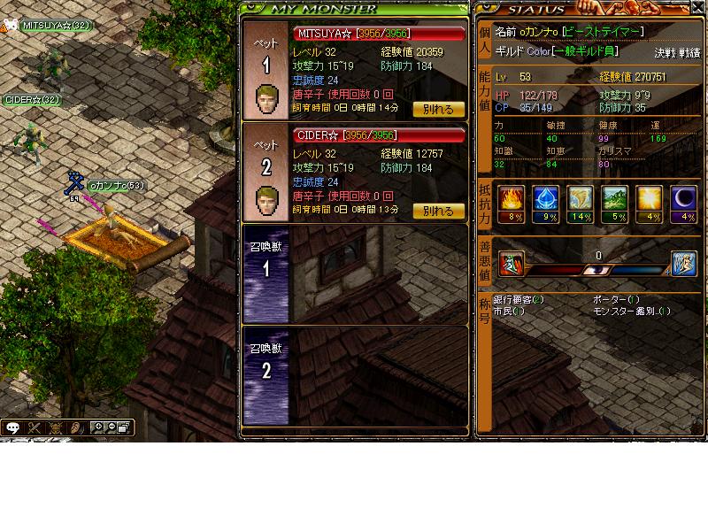 おざまーす!みんな変態元気でしょうねええ。今日もガンバッテいきまっしょい!で、ネタないのでSSペタリゴールドが邪魔だったんで無理やり編集320になりました。ちょび地獄まであと10lvまったり行きたいと思います。320になったので一個階降りたんですが、人が多くてw狩り安そうなんですがね隔離の必要もなさそうだし、まだ狩れてません、空いたら行こうと思います@q@さて次リザオネでのGV 集まり良いですね。もうフェネのブログで貼られてますがネタないので貼り、lvは隠さなくていいや面倒だし。結果は撮ってない^q^;完封全滅勝利です!LA一回しか取れなかった@q@次は今日なんで頑張ります。ColorでのGV相手は古巣 夢想連心!気合入れて逝きました。こちらは制限ということでtop2が欠場、1PT満火力1での戦い相手はどう考えても倍以上いました。すぐ囲まれますね、ちょっとでも塊から抜けるとフルボッコ、最初はなんとか戦えましたが、一回崩れたら立て直すのがつらい、コルしようと塊から出たらフルボッコ暗いました。ハイ、2回程死にました。一回目は天使になっていて完璧PSミス卵になれないほど足止めくらいました。2回目はBISでいたんですがもうあれは無理どうしようもない、参りました。ってかマーチンさんあれで手なしとか鬼だろw火力が多くてどこからでも狙ってきてましたね。こちら火力1なんでどうしても塊だと辛かったです。万病0ですよええ敵からもらいたかった。結果負けました。まぁ無理もないか・・・今度は制限なしで戦ってみたいですね。ジャニー^w^