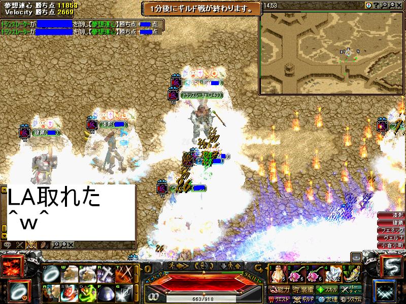 こんばんワンU・ω・Uトランスでっす!さてネタもないのでリザオネのGVからいってみましょう。集まりです。バランスいいですね、とても良いです!さて中盤絶対自分のLA取りましたよね^^そうじゃないと取り忘れるんだもん><もう完全押せ押せムードでした、自分はどっかいってタイマンとかしてました^^すいません結果ハイ取り忘れたよ!まぁかんぷう全滅勝利です。今日は強豪まつぼっくりさんです。がんばります。続いてカラーで一人でできるもんさんとのGVです。こちらは1PT満+2ゴキブリでした。あちらは2PT+ちょっとだったかなと思います。まず俺はコルで味方はこんでディスペしてました。2回目の衝突でコルしたあと狙われたんですが、卵やってるんですが発動しなくて死にました。やっぱ天使はやわいんできつかったです。生き返ってからはBISしてましたwヒーリング中心に。途中までは100点差ぐらいでしたが、一回こちらが2000点ぐらいはなして、そのまま取られ取りつつの気が抜けない戦いでした。しかし、何回目かの衝突のときにこちらのPTのほとんどが倒れてしまい逃げこるをしようとしてたら440ぐらいの剣士さんに追われ振り切れずにいたらこちらのPT全滅、俺も結構やばっかったのですが、もう危ないって所で剣士さんがコルされたのでコルをして立て直しました。あのコルがなかったらこっちは全滅していたと思います。こっちとしてはとっても助かりました。そのあと最後の衝突があり、2,3人倒されたところで、タイムアップ。結果は9000:12000ぐらいでした。点差以上に緊迫していて終わった後は超疲れましたwたぶんこちらが勝てたのは、オレンジさんと毘沙門天さんがやわい人にしっかりタゲを合わせていたからだと思います。まぁほとんど関係なく倒していましたけどねw相手のほとんどの方は一回倒していたんでないでしょうか。あとWIZ1という厳しい状態でまわしてくれたアスヒだと思います。大変だと思います。個人の反省としては死んだときにBISに戻る時間もあったのでそこらへんの判断ミスだと思います。まぁ結局買ったもん勝ちや!(テニプリ参照最後にメインクエ1の最後のロシペル秘密での一風景すごくね?(笑)ジャニ^w^