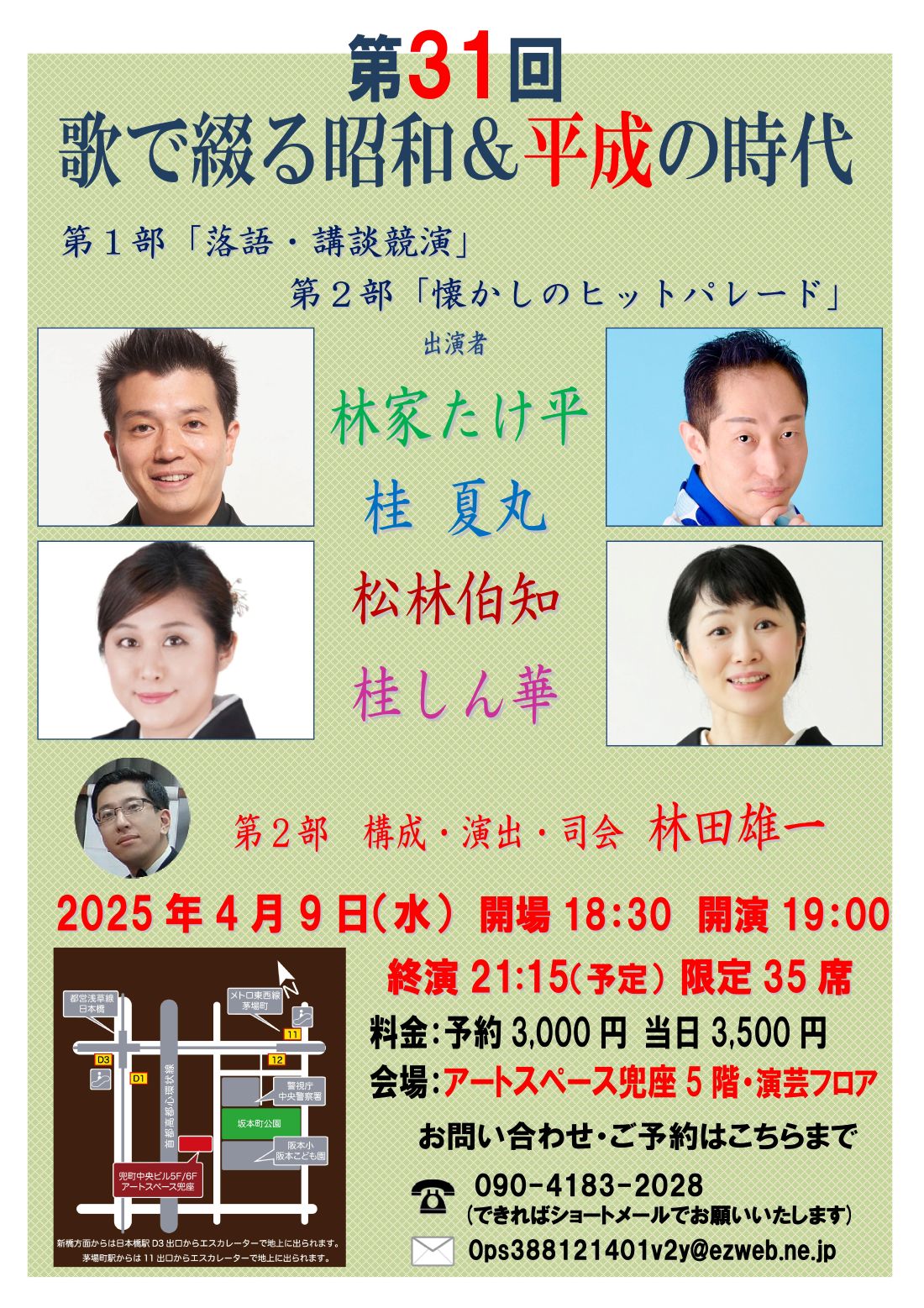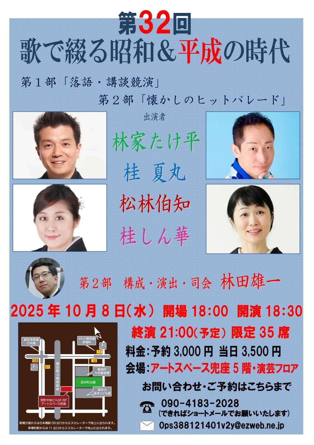 「第32回・歌で綴る昭和&平成の時代」開催日…10月8日(水)出演…林家たけ平、桂夏丸、松林伯知、桂しん華 (第2部司会)林田雄一会場…アートスペース兜座5階・演芸フロアアートスペース兜座 日本橋のアーティスト向けレンタルスペース開場…18時 開演…18時30分 終演…21時ごろ料金…(予約)3,000円 (当日)3,500円 *限定35席第1部…「落語・講談競演」第2部…「懐かしのヒットパレード」ご予約は、下記の携帯かメールアドレスまで!0ps388121401v2y@ezweb.ne.jp090-4183-2028 (←できればショートメールで)毎度のメンバーでお送りする豪華ショー!数えて32回目!もう13年やってます(笑)!開催まで(9月30日時点)あと9日!まだギリギリですがお席がございます!ご予約はお早めに!今回は増位山太志郎さん・和泉雅子さんの追悼コーナーがございます…と前回書いたのですが、そこに橋幸夫さんと栗塚旭さんが入ることになりました…。勿論、戦前~戦中のヒットパレードもございます!10月8日(水)晩は、是非ともアートスペース兜座へ!