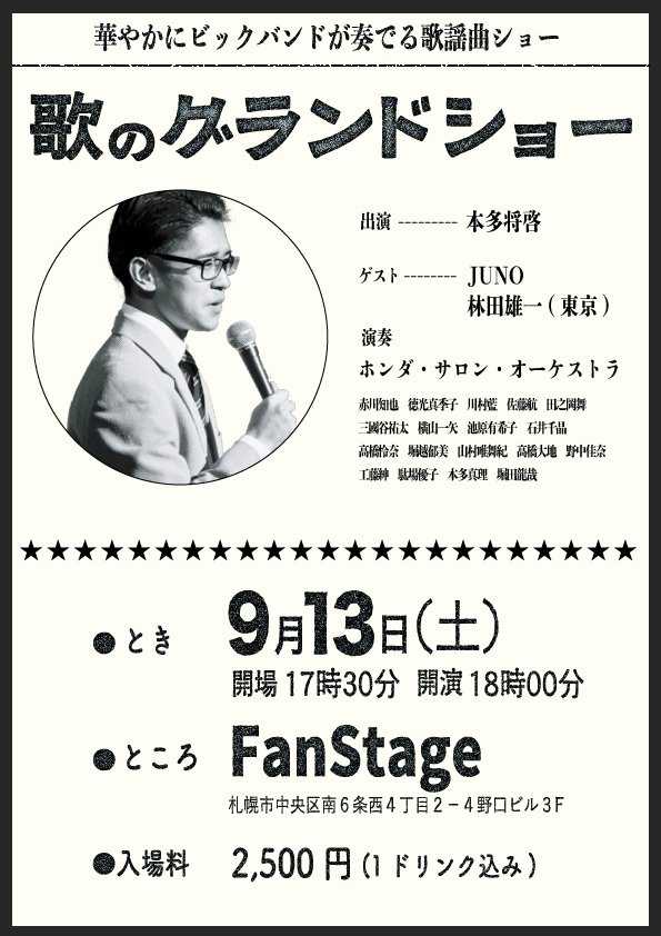 いやいや…Ⅹに慣れてしまうと、ホントにこちらのことを失念してしまいますわね(苦笑)。いろいろ世の中あったのに、Ⅹのほうが短文だから、手っ取り早く書ける&レスポンスが早い…ってのが楽でねぇ…。久しぶりに、こちらにも多々宣伝のほうを書かせていただきます!------------------------------------------------------------------9月12日(金)の午後…羽田を私は飛び立ちます!私が43年ぶり(3歳以来)に北海道・札幌の土を踏むという!28年ぶりの飛行機(高3の修学旅行以来!)!そしてそして!人生初のひとり旅!飛行機の乗り方が分からない(涙)‼‼そのような恐怖(?)を乗り越えて、私が行く営業はこちら!『歌のグランドショー』開催日…9月13日(土)開場…17時30分 開演…18時 終演…20時過ぎ(予定)会場…FanStage(札幌市中央区南6条西4-2-4 3階)FanStage料金…2,500円(1ドリンク付き)出演…本多将啓(演奏)ホンダ・サロン・オーケストラ(ゲスト)JUNO、林田雄一予約先… 160honda1911@gmail.com私の昭和歌謡マニアの北海道代表であり、ビッグバンド「ホンダ・サロン・オーケストラ」のバンマスでもある本多将啓さんが、初めて開催するワンマンライブ!20人弱のフル編成で、ジャズと昭和歌謡をたっぷり楽しめる超豪華イベント!ゲストが女性歌手のJUNOさんと、不肖・私でございます(苦笑)。道外からも是非お休み(有休)を取ってお出でいただきたいぐらいの充実した内容になってます!…まだ間に合うでしょう(←無責任)。私は司会と、途中「『なつかしの歌声』大メドレー(歌真似)」と、戦後のコーナーでも2曲、歌真似をやらせていただきます。子供のころからの夢だった「フルバンド伴奏での歌唱」が35年?ぐらいのときを経て、ついに実現する日が来ました(号泣)!ここでの宣伝が、開催ギリギリになってしまったことをお詫びいたしますが、とにかく道外からもお出でくださいませ!---------------------------------------------------------------そして東京近郊の方は、10月8日(水)晩に茅場町「アートスペース兜座」5階にお出でください!こちらはお馴染み吉例公演!「第32回・歌で綴る昭和&平成の時代」開催日…10月8日(水)出演…林家たけ平、桂夏丸、松林伯知、桂しん華 (第2部司会)林田雄一会場…アートスペース兜座5階・演芸フロアアートスペース兜座 日本橋のアーティスト向けレンタルスペース開場…18時 開演…18時30分 終演…21時ごろ料金…(予約)3,000円 (当日)3,500円 *限定35席第1部…「落語・講談競演」第2部…「懐かしのヒットパレード」ご予約は、下記の携帯かメールアドレスまで!0ps388121401v2y@ezweb.ne.jp090-4183-2028 (←できればショートメールで)毎度のメンバーでお送りする豪華ショー!数えて32回目!もう13年やってます(笑)!今回は増位山太志郎さん・和泉雅子さんの追悼コーナーがございます。あと今までやったことがないコーナーを実験的に設けることができればと考えておりますが…失敗しそうなんでやらないかもしれません(苦笑)。是非ともご来場を!