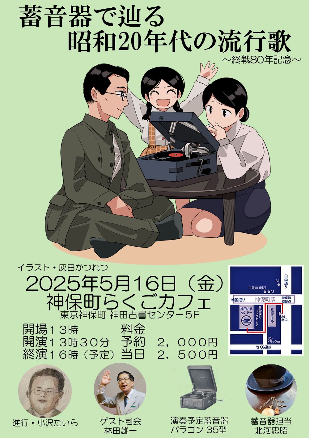さあ!今年は「昭和100年」なので、あちこちで昭和を回顧するイベントが多そうですが、私も今のところ2つだけですが(苦笑)、4月と5月にイベントがございます!まず4月のほうから!毎度お馴染み吉例公演のお知らせ!「第31回・歌で綴る昭和&平成の時代」開催日…4月9日(水)出演…林家たけ平、桂夏丸、松林伯知、桂しん華 (第2部司会)林田雄一会場…アートスペース兜座5階・演芸フロアアートスペース兜座 日本橋のアーティスト向けレンタルスペース開場…18時30分 開演…19時 終演…21時15分ごろ?料金…(予約)3,000円 (当日)3,500円 *限定35席第1部…「落語・講談競演」第2部…「懐かしのヒットパレード」ご予約は、下記の携帯かメールアドレスまで!0ps388121401v2y@ezweb.ne.jp090-4183-2028 (←できればショートメールで)今回から会場が変わります。地下鉄東西線「茅場町駅」が最寄りの「アートスペース兜座」での開催です。非常に小さな会場ですので、チラシにも記しましたが「限定35席」ということにいたします。ということで、ご予約・お問い合わせはお早めにお願いします!今回はアイ・ジョージさん・三浦洸一さんの追悼コーナーを設け、故人を偲ぶほか、なつかしのヒット曲を5人で歌いまくることになるかと…。そして、1年半ぶりに林家たけ平師匠が復活(?)を果たしますので、是非ご来場ください!------------------------------------------------------------------そして5月は、当方がゲストで呼ばれる会が1年3か月ぶりに!「蓄音機で辿る昭和20年代の流行歌」開催日…5月16日(金)開場…神保町らくごカフェ開場…13時 開演…13時30分 終演…16時(予定)料金…(予約)2,000円 (当日)2,500円司会…小沢たいら https://x.com/crazy_cats1955ゲスト…林田雄一 https://x.com/h3yosebanasi蓄音機担当…北河忠昭 https://x.com/anakuro69予約…tairataira1962@gmail.com (名前・人数・連絡先を明記)今回は昭和20年代のお馴染みのヒット曲を中心に、2時間半の長丁場で20数曲のヒットパレードがお楽しみいただけます!私は大半の歌(?)に、玉置宏&青空たのし直伝のイントロ司会を付けてくれ!との依頼を、小沢君より受けましたので(笑)必死に頑張りたいと思っておりますです!こちらも、らくごカフェでの開催ですので…40人で予約受付は締め切りという感じになるかと思います。平日昼間の開催ゆえに、有給申請などのご都合などもあるかと存じます。お早めに上記のアドレスにご連絡をお願いいたします!