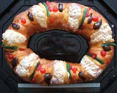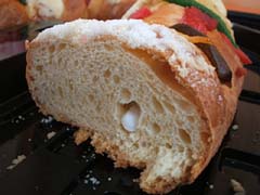 昨日1月6日は、三賢人の日 Dia de Reyes でした。去年はこの日、まだ旅行中でメキシコに居なかったので今年こそは!と思っていたのに、旅行疲れで昨日は一歩も外に出れず、あきらめていたのですが、今日、まだありました・・・・・・! 三賢人のパン!(って売れ残りではなく、ちゃんと今日焼かれたパンが!)死者のパン、グアダルーペのパン、と、祝日というと特別なパンが出てくる、なんともパン好きなお国のようです・・・・・・^_^;三賢人とは、イエスキリストが生まれた時にそばに居た、だか、そばに現れた、賢者のこと、です、よね? たしか^_^;だから、ポサダ、クリスマスに続く、カトリックの重要な祝日です。メキシコの子供達はラッキーです。クリスマスに続き、この日もプレゼントをもらえる日なんですって!そして、この日までクリスマスツリーをはじめとするクリスマスのデコレーションが飾られたままになっています。そーいえば、ペルーでもまだツリーは飾られていました。日本人的には松のお飾りにしたいところですが^_^;そして、三賢人のパン Rosca de Reyes ロスカ・デ・レジェス。こんな、ドーナッツ状のパンです。ブログネタのために(!)買ってみました^_^;死者のパン、グアダルーペのパンも巨大だったけど、今回のも巨大っ!ウォルマートには1kgと2kgのものが売られていて、これで小さいほう。そして、死者のパンやグアダルーペのパンに比べて、とても高くてビックリ!小さいほうで80,90ペソ(約810円)、大が153,50ペソ(約1530円)!ブログのためとはいえ、800円のパンは高かった・・・・・(-_-)中の人形代!?だって、味はほんのり甘いパンで、他のふたつと大差ない感じだし(-_-)さてこのパン、みんなで切り分けて食べます。この中には人形がひとつ入っていて、それが入っていた人は大当たりっ!!2月2日のろうそく祝別の日 Dia de la Candelaria に、みんなにタマールをご馳走しなければならないんだそうです!(^^)!
