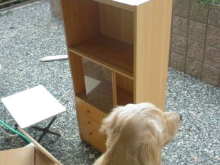 皆様 おはようございます。 シルバーウィーク いかがお過ごしですか。 アルローラです。こちらは 昨日まで良いお天気でした。今日は ポツポツと雨が降ってます。さて、昨日 私はまたペンキ塗りをしましたよ。実家にあった棚を持ってきました。カラーボックスってのですかねぇ 安い棚です。 まずは ガラス戸や中の棚を外し 引き出しも取り出して、全部バラバラにしました。その後 ガシガシとサンドペーパーがけ.....これが1番大変で ちっとも面白くない作業です(-_-;;)こすれた粉は吸い込むし 力もいるし・・・でもやっておかないと ペンキが上手く付きませんから何事も 下準備が大切ですね。。。黙々と続けます(-_-;;)2時間近く続けて、まず ひと休み... その後 塗りにかかりました。塗っては乾かし 塗っては乾かし・・乾かしてる時の様子は こんな感じ。 こんな感じで 夕方まで続けました。5時くらいになって、ようやく完成~。 ヤレヤレ...家の中に入れてみました。 扉や引き出しのツマミは 新しく買ってこようと思ってます。昔売ってた練り飴みたいな ガラスで出来た綺麗な取っ手がイイナ~。。。こちらは 今朝のガウス。昨日は一日 母は遊んでくれなくって、つまんない日だったねぇ^^;)なので、キミのお気に入りの事をしてあげよう~(^0^;) ・・靴下を履く時 嬉しそうに寄ってきます。カパッと鼻にかぶせると 嬉しそうに尻尾を振って、ジーーーーッとしてます;;;何が楽しいんやら、母には理解不可能ですけど^^;;)遊んでる感じが嬉しくて いいんですかねぇ。 さて 今日は何しましょうか。。。 じゃぁ またね。