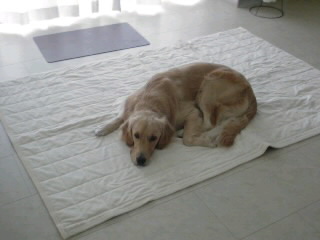 雨模様が続いてますね おかわりありませんか アルローラです。今日は リビングのマットを出してきました。一応 洗って仕舞ってあったのですが、掃除機をかけて敷きました。掃除機を仕舞ってる間に・・既に 横になっておられる...(-Д-;;) ・・・オイ...(-o-;;)昼間はガウスと二人きりが多いので 色々遊んだりもしてます。オヤツを・・こんな所に・・ クー ( ≧艸≦)upupu...必死に待ってます お母さんのイヂワル....可愛い子には イヂワルしたくなるもんです(@´艸`)1年前からは想像もできないくらいに 我慢強くなりましたね^^;;)えっと・・同じようにマテをさせて撮った画像なんですが・・載せるかどうか 随分と悩んだんですけど・・ えぇい 載せてしまえっ ガウスを下から見上げる の 図... ^^;;)クタクタの シワシワ顔になります 百年の恋も いっぺんに冷めてしまうくらいの顔です(^0^;;)ゴールデンって みんなこんな風にタルタルの皮膚なんじゃないでしょうか? ぇ.. 違う???こんなにブサイクになりませんかっ ・・・ウチの子だけかしらん;;; ま.. まぁイイ明日はちょっとお天気も良くなってくるようです。そろそろ畑を整理したいですね~♪ じゃぁ またね。
