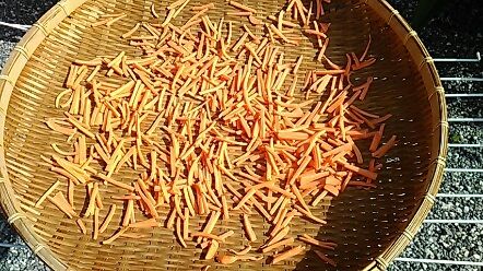 皆様コンニチハ よく晴れて気持ちの良いお天気になってます。 アルローラです。ワタクシ 最近、人参をよく干しております今朝もやりましたよ~このように、マッチより少し太めにして 3本くらいを干します。 お天気がいいと、1日でカラカラになるし これがまた使い易い人参3本が だいたい このくらいになっちゃうし、慌てて使わなくてもいいので大助かりです。 冷蔵庫に保存して いろんな物に使ってます。 おススメ~すでに両親が他界してるので、親孝行とかできない私は たま~に叔母に贈り物をしてます。大阪に住む叔母は 一人暮らし。バッグが好きな人なので 送るのはバッグが多いかなぁ。とても喜んでくれるので、私も嬉しいですで、送るとまた何か贈ってくれる;;; 「べつに えぇよ」 と言っても「えぇわ えぇわ。 で 何がいぃ?」 と言われ、遠慮なく「〇〇」と言い返してる~こういう事をストレートに言える仲って、素敵やなぁと思ってます。今回はキムチ これまた 大量に送ってきてくれたわ~あまり多かったので、酸っぱくなる前に ご近所3軒にお裾分けしました。それでもこの量;;; 大根・白菜・ネギ・レンコン・キュウリ。 甘いイカもありました。鍋にしたり お好み焼きにしたり、楽しもうと思います。同じ箱の中に 同じ店で買った靴下や ちょっと風変わりなスリッパも。 洗濯機でガシガシ洗えそうなので、これからの季節にいいですね着いたらすぐに電話~ 「ありがと 今 着いた~」 「ホンマ? 速いなぁ 私が電車 乗ってくより速いんちゃうか~」しばらく話し、会話を楽しみました本来だと 6月に本家で法事があるので逢えるはずだったけど、こんな世の中だし 取りやめになりました。逢えなくても こうして懐かしい声が聞け 話せるだけで気持ちが落ち着きます。6人兄弟の一番上(母)と 一番下(叔母)。 中は叔父ばかりで 私にとって唯一の叔母です。歳も近いので とても話し易いし、頼りになります。いつまでも元気でいてほしいナァ。。。 じゃぁ またね。
