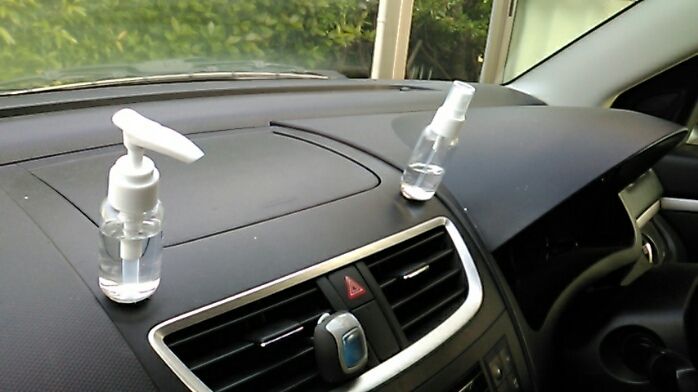 スプレーの底に金属を付け、車に磁石を付け 取り外し可能にしておるそうです。