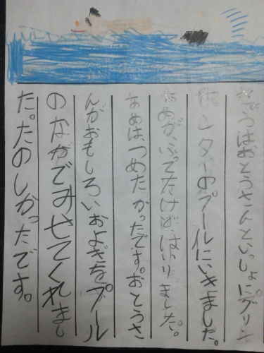 夏休みも後半戦ですね~。まだまだ宿題も色々と残ってるよ~('A`)ジョーくんもパパも、ノンキだからなぁとりあえず、ジョーくんの夏休みの宿題の絵日記の一部を公開「おとうさんの面白い泳ぎ」私も見たかったわぁ(* ̄m ̄)ノ彡_☆ばんばん パパに言わせれば、いたって普通に泳いでたらしいけどジョーくんから見たら、面白かったらしいよパパ、どういう泳ぎ方してんのよ(*≧m≦*)ププッあと、普段は「パパ」って呼んでるのに学校の宿題とかだと、ちゃんと「おとうさん」って書くんだね。ちょっとした発見です