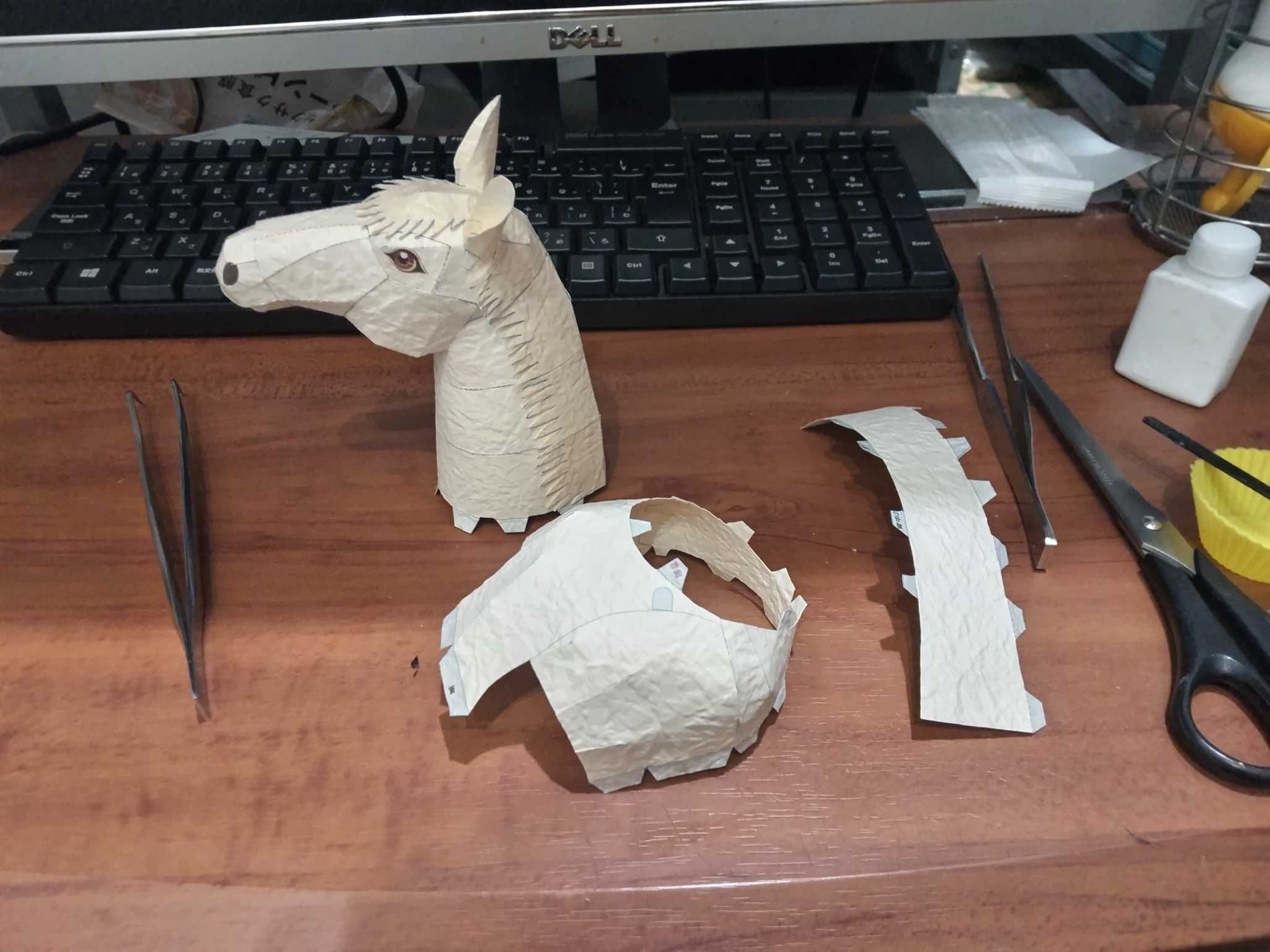 来年の干支の馬を作っている。店のほうで白い馬を作り出した。今日は頭から上半身まで組…