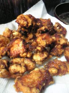 最近たまにだぁが変・・・昨日も変でした。前まではだぁがちびたんを入れるのが日課だったのですが、今は、めぇが入れて当たり前になっている様でたまに早く帰ってきても「お前が入れろや」というくらいだったのに、昨日はちびたんとの入浴中に突然入ってきました。しかも、お風呂から上がってから「からあげあげたるわ」と・・・してくれるのは嬉しいけど 気持ち悪いねぇ(ーー;)これがしょっちゅうな事だったら「うちの旦那ってめっちゃ優しくてねぇ♪」ってところなんだろうけどさ。何かやましい事でもあるんだろうかねぇ。携帯は完全ロックしだして、夜中はマナーにしてるし、年賀状は必要枚数の中、めぇの知ってる人は教えてくれるけど残りの人は「お前に言う必要はない」「関係ない」「何で言わなあかんの」と。なんだろねぇ。そんな事はどうでもええけど、揚げ物は慣れてないといつできたかわかりづらいよね。だぁはめぇにはできて自分ができないと思われるのが嫌なので「何からしたらいい?」と聞いてきました。準備はできていたので、油に入れてちょうどいい時に出すだけだけど・・・「油がピチピチいってきたらどんどん入れていいよ。」だぁを放っておいてめぇは髪をかわかしにいってきました。その間3分程。もうからあげがペーパーの上に取り出されてる!!!「まだやと思うよ。」「いけるって(`へ´)!!!」と、口を出すなといわんばかりに。強引に目の前でキッチンバサミでチョキンと半分に切って見せてあげました。外がうっすらあがっていただけで中は真っ赤でした。「火が強いから外だけは黒くなるねん。持ち上げた時にジリジリと菜箸から伝わってきたらいけるで。」「お前もなかなかやるな!せやけど、お前の方がもっと真っ黒やって!!」とどうしても認めたくないようですが、勝手に言わせておきましょ。めぇは最近揚げ物成長期の為、かなり腕があがりました。今は、からあげは噛むとジワーっとジュ~スィ~な感じにできる様にまでなりました!初めは、昨日のだぁと同じようにちょっとスカスカで硬い感じだったけどね。その前に結婚した当初は揚げ物はしませんでした。そして、初挑戦した時は怖くて入れる為に火を止めていました。からあげは火があたたまっていない時から入れていいってテレビで言ってたのでずっとそうしていましたが、今は何でもこい!!!あっ、でも、冷凍モノを直接入れるのはちょっとビビッてるかも!!!昨日のだぁのからあげです。(実際の方がもう少し黒いです。)めぇが作ったなら「焦げてる!」と文句を言われそうですが、おいしくいただきました。