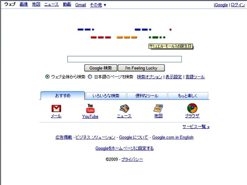 例年通りですが、今年のGWは仕事です。まぁ、建設プロジェクトに休みはありませんから・・・仕方ありません。 さてはて、GoogleのWebページに何やら気になる「点と棒」が・・・まさかと思い、声に 「ツー・ツー・ト ~」 と読んでみると モールス信号ではありませんか。「こいつモールスでGoogleと打ってやがる。やるな・・」と思った私でした。何でも昨日、4月27日はサミュエル・モールスさんの誕生日だったようです。モールスを打つ者として、恥ずかしいですが、誕生日だとは全く知りませんでした。 (おまけ)電信の打電風景(神奈川県水産技術センター:三浦市)