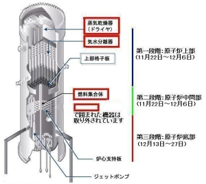 原子力の恐怖をご堪能ください。何でこんな題名にしたのか自分でも分からん・・・でも、政府や電力会社のプレス発表を聞いていると、そう暗示しているのではないかと思ってしまうほど、明瞭な説明がされていない気がします。とても残念です。政府や企業は100%問題ないと確認できるまでは、「問題ありません」と言いませんし、社会的な責任から憶測では言えないのだと分かります。でも、また逆も然りで、手遅れになる見込みが濃厚でも、完全に手遅れの段階になるまで、「手遅れです」と言わないのものです。 ところで、ここで少し原子力発電の話を書いてみたいと思います。 今回の地震でトラブルが起きている原発は東京電力が福島県に建設した・ 福島第一原子力発電所・ 福島第二原子力発電所の2箇所のようです。「水を原子炉に注水」というキーワードをテレビでよく聞くと思いますが そのあたりを含めて少し書きたいと思います。 そもそも水はなぜ必要かイメージしにくいかもしれませんが、水が必要な理由は大きく2つあります。簡単にいうと・・・理由(1)【核分裂反応で生じる熱を用いて蒸気をつくり、蒸気タービンを回すため】熱を発生させてもタービンを回せなければ、電気はつくれません。そのため、熱エネルギーを運動エネルギーに変換する上で蒸気、すなわちもととなる水が必要です。冷却水として活躍する訳です。 理由(2)【減速材として機能し、核分裂反応を制御するため】核燃料であるウランのウラン235原子に中性子を当てると、ストロンチウムとキセノンに核分裂しエネルギーを放出すると共に、中性子2個が放出されます。この中性子が他のウラン235に当たることで、核分裂の連鎖反応が起きますがこの中性子(高速中性子)をそのままウランに当てても核分裂反応は起きません。放出された中性子は、「減速材」というものを用いてエネルギーの低い「熱中性子」に変えてあげないと、核分裂反応を起こせないのです。この減速材に水(軽水H2O)を用いているから、水が必要不可欠なのです。 今回のように原子炉が停止している(=臨界状態ではない)状況では、冷却水としての機能だけになるので、減速材の話は割愛したいと思います。 今回は地震による大きな揺れをセンサーが感知して、原子炉が緊急停止(スクラム)したようです。緊急停止する場合は直ちに発電機を解列すると同時に制御棒(核分裂の連鎖反応を断切るために、中性子を吸収させるモノ)を炉心内に全て挿入することで、核分裂を止めます。 核分裂が止まれば 「熱」 はもう発生しないのではないの?と思われるかもしれませんが、実はしばらく熱が出続けます。原子炉は停止した後にも「崩壊熱」というものが発生しますので数日は冷やし続けなければなりません。核分裂反応で発生した核分裂生成物は、原子核が不安定な状態であり、自らα線やβ線など放射線を放出しながら、安定な状態へと戻ろうとしますがその際にこの「崩壊熱」が発生してしまいます。 原子炉の設計において、原子炉停止後も崩壊熱を除去し、燃料の溶融を防止するための停止時冷却系を備えることが大前提であり、万一に停電しても非常用発電機を使用して、冷却水を炉心に注水できますし、非常用炉心冷却系(ECCS)を備えています。しかし、今回は地震の影響で非常用発電機が使用できないか、ポンプが故障して炉心冷却ができなくて問題になっているようです。 そのため、電源車や仮設ポンプを手配して、何とか炉心へ注水して炉心冷却しようとしているようですが、注水が追いつかず、炉心の一部が水面からむき出しになってしまっている状況のようです。 専門家がもっとも懸念しているのは核燃料が燃料棒をはじめ燃料集合体もろとも溶融すること。 特に燃料ペレットと呼ばれる核燃料を細長く固めたものを包む被覆管(ジルカロイ合金)の酸化作用から軽水の酸素O2と結合し水素ガスを発生させて爆発を誘引する事、および溶融物が原子炉圧力容器をも溶融し、容器自体に穴が開くことで根本的に原子炉を破壊し、水蒸気爆発を誘引することで絶望的な放射能漏れが生じる事などの危険が想定されるのです。原子力保安院の方が記者会見で少々興奮状態にあるのはその為かもしれません。 東京電力が使用している原子炉は「沸騰水型軽水炉(BWR)」という種類で「加圧水型軽水炉(PWR)」のように一次冷却系と二次冷却系と分かれていません。つまり圧力容器に出入りする放射能をもつ冷却水が直接タービンまで行って循環してますので、「蒸気漏れ = 放射能漏れ」に直結することになります。 また、沸騰水型は蒸気圧が低いため、圧力容器も蒸気配管も加圧水型と違って薄いつくりであり、異常な蒸気圧に対してどの程度耐力があるかが気になります。 なお、万一、冷却材が喪失しても炉心部が露出しないよう冠水能力を増強したもので、「改良型沸騰水型軽水炉(ABWR)」というものが1970年代から研究されており、東京電力では1996年 柏崎刈羽6号機に初