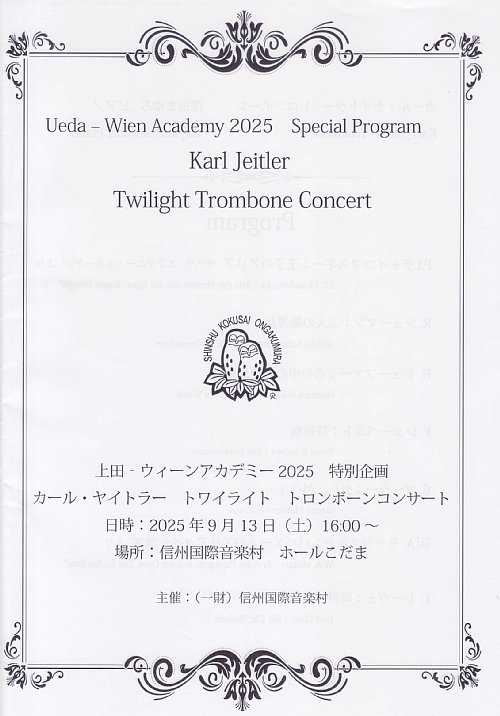 開催日:2025.9.13(土) 16:00開演場所 :信州国際音楽村 ホールこだま(300名収容)9月12日から開講した上田ウィーンアカデミー2025の目玉である、カール・ヤイトラー トワイライト トロンボーンコンサートに行ってきました。プログラム1.P.I.チャイコフスキー:王子のアリア オペラ「エフゲニー・オネーギン」より2.R.シューマン:二人の擲弾兵3.H.シェーファー:森の中の郵便馬車4.F.シューベルト:菩提樹5.G.マーラー:外へ、外へ!6.W.A.モーツァルト:パパゲーノのアリア オペラ「魔笛」より7.レーヴェ:時計アンコール7.オーストリアでとても有名なお酒を飲む歌 ワイン貯蔵庫にて8.小さい秋みつけたレポート9月12日から開講して15日までの上田ウィーンアカデミーの最初のコンサートは、昨年に続きトワイライトコンサートということで夕暮れ時に向かっての16時スタートという時間設定のもと、アカデミー受講生と一般の聴衆のもとで厳かに演奏が始まり、ヤイトラー氏の温かく音色のすてきな演奏にとても心地よいひとときを感じることができました。そして今回、ヤイトラー氏が恩師のH.バウアー氏より譲り受けた楽器で、1965年にドイツの工房Kuhnで作られた楽器を、ヤイトラー氏自らが本公演のために特別に持参して使用するという貴重な機会となりました。演奏を聴いた感想としては、楽器は変わってもやはりヤイトラー氏の音色は健在なのだなあということで、感慨深いものがありました。また演奏曲のパパゲーノのアリア オペラ「魔笛」よりは、昨年7月の三井清夏ソプラノリサイタルにおいて拝聴したオペラ『魔笛』より「パパゲーノ-夏の恋物語」(日本語訳上演)において、パパゲーノ役のバリトン宮本益光氏が歌っていた曲ではなかったか…ということで、ピアノで演奏されていたメロディーが宮本氏が吹いていた笛のメロディーと同じであったことから、より親しみを感じました。そしてアンコールでは、ヤイトラー氏といえばお酒好きということで、演奏すると気分が上がってくるので、お酒を飲みたくなる!というお話があった上で、今年もアンコールにてお酒にまつわる曲の演奏がありました。また締めくくりには日本の秋の歌「小さい秋みつけた」が演奏されましたが、今年は長かった猛暑がようやくここ数日25℃くらいまで気温が下がってきて秋の気配を少し感じるところでのタイムリー感が素晴らしいと感じました。まとめコンサート終演後は、ヤイトラー氏がロビーに出て、アカデミーメンバーや来場者と談笑するというひとときが設けられました。またワンドリンク付きということで、ホットコーヒーや冷たい麦茶。ワインが提供され、折からの暑さを癒したり、宿泊するアカデミーメンバーは、ワインを楽しんでいる様子がありました。