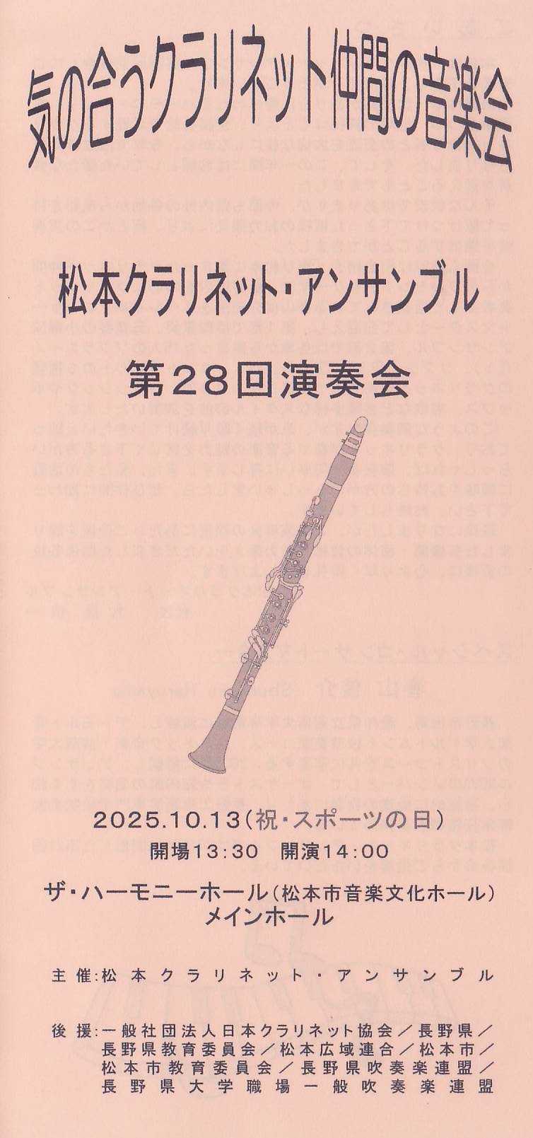 開催日:2025.10.13(月) 14:00開演場所 :松本市音楽文化ホール・メインホール(693名収容)松本クラリネットアンサンブルの第28定期演奏会に行ってきました。また縁あってSTAGE2から演奏者として参加させていただきましたので、演奏者視点でのレポートもさせていただきます。プログラムSTAGE11.おもちゃの兵隊の観兵式2.「スペイン組曲 第1集 作品47」より第3曲「セヴィーリャ」3.喜歌劇「こうもり」セレクション4.情熱大陸STAGE25.「組曲 ニ短調 HWV448」より第5曲「シャコンヌ」6.スラヴ舞曲 作品72 第2番7.ハンガリー舞曲 第6番8.ファンタスティック・ズー!9.「管弦楽組曲 第3番 ニ短調」より第2曲「アリア(G線上のアリア)」10.「となりのトトロ」メドレーアンコール11.アリオーソ12.聖者の行進レポートおもちゃの兵隊の観兵式クラリネット4重奏による演奏で、オープニングによく似合う推進力のある楽曲ですが、私自身この曲はかなり前に使っていたガラケーの着信音の1つで入っていたことが記憶に残っており、電子音にも関わらず完成度が高かったので、気に入って着信音に設定していたことを懐かしく想い出した次第です。「スペイン組曲 第1集 作品47」より第3曲「セヴィーリャ」クラリネット4重奏による演奏で、サクソフォーンアンサンブルで演奏されることが多いという紹介がありましたが、金属的な艶のあるサクソフォーンの音色とは違うクラリネットの木の暖かい音色でのこちらの曲のアンサンブルは、また違った味があってとてもステキだなと感じました。喜歌劇「こうもり」セレクションクラリネット5重奏による演奏で、今年はシュトラウス2世の生誕200年であることから、こうもりの演奏機会も多い訳ですが、そんな名曲こうもりのおいしいところをつなぎ合わせて作られたのがこちらの楽曲ということで、楽しく聴かせていただきました。また私自身、この曲は昨年別団体で演奏した縁もあってより親しみを感じるところがありました。情熱大陸クラリネット5重奏による演奏で、葉加瀬太郎氏による楽曲ですが、どこかマシーンを連想させるような特徴的な伴奏に格好良い旋律がのっかるということで、とても粋な感じを受けました。またこの曲は、吹奏楽でも複数のアレンジが存在しアンサンブル用の楽譜も多数出版されていることから、より耳なじみのあるポピュラー音楽なのだなと改めて感じました。「組曲 ニ短調 HWV448」より第5曲「シャコンヌ」ここからは今回の演奏会に集った15名の出演者全員による演奏となりましたが、まずはヘンデルの有名なシャコンヌからスタート。こちらの楽曲は、音の処理がやや独特で特に伴奏は楽譜通りに演奏してしまうとシャコンヌらしくない…という印象がありました。また響きのよい音楽文化ホールということもあり、そのあたりも考えつつの演奏となりました。スラヴ舞曲 作品72 第2番~ハンガリー舞曲 第6番2曲続けての演奏になりましたが、曲紹介の中でブラームスのハンガリー舞曲がまずあって、ブラームスの勧めでドヴォルザークがスラヴ舞曲を書いたというお話があり、この有名な2曲にそんな関連性があったのかと大いに興味が湧いたところでした。楽曲の方は、スラヴ舞曲は、私のイメージとすれば濃いグリーン。木が生い茂った暗めの湖のほとりで流れる音楽といったイメージを持ちながらの演奏となりました。そしてハンガリー舞曲はスペシャルコンサートマスターの春山俊介氏がリハーサルで何を考えているかわからない女性とつきあって振り回されている感じの曲と表現されていましたが、まさしくそんなじゃじゃ馬的な曲。意表をつかれる音楽というところです。ファンタスティック・ズー!~動物童謡メドレー~犬のおまわりさん~ぞうさん~山の音楽家~証誠寺の狸囃子~かもめの水兵さん~七つの子~お猿のかごや~兎と亀~かたつむり~金太郎~森のくまさん~かえるのうたを組み込んだ大メドレーですが、冒頭がサン=サーンスの動物の謝肉祭になっているのがとてもお洒落だなと感じました。私自身この曲は、過去に何度か演奏した記憶がありますが、曲紹介でファンタステスィック・シー!という兄弟分の曲もあることに触れられ、そちらにも興味が湧いた次第です。「管弦楽組曲 第3番 ニ短調」より第2曲「アリア(G線上のアリア)」曲紹介でヴァイオリンのG線だけで演奏できるからG線上のアリアというお話があり、そんなことを念頭に置きつつ、バッハの超有名曲をヴァイオリンの弦をイメージしながらの演奏となりました。「となりのトトロ」メドレーさんぽ~五月の村~風の通り道~ねこバス~エンディングテーマのメドレーで、もともとはクラリネット6重奏曲による福田洋介氏による編曲版ですが、私自身1月に6重奏で演奏したこともあって曲の構造はわかっていましたが、パートが変わったことで、同じ山を違う登山道から登るようなイメージがあってとても新鮮な気持ちで演奏することができました。アリオーソ過去のクラリネットクワイアー関連の演奏会でアン