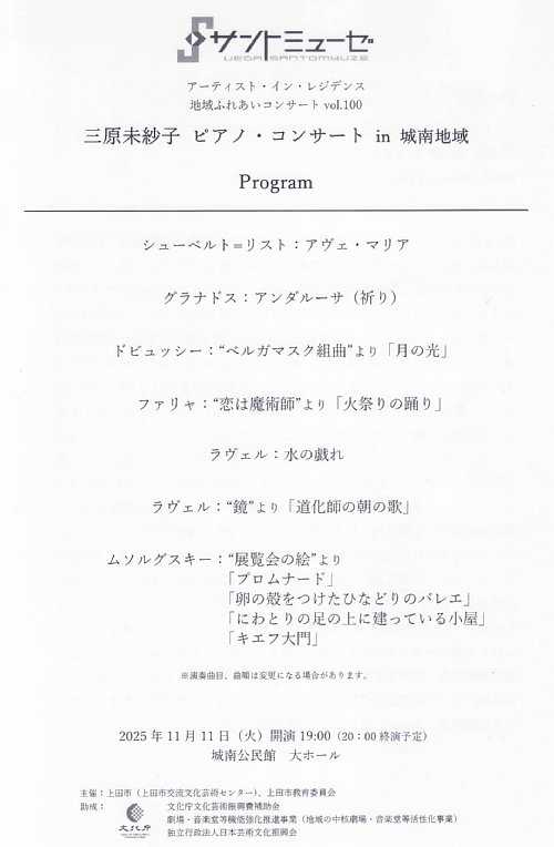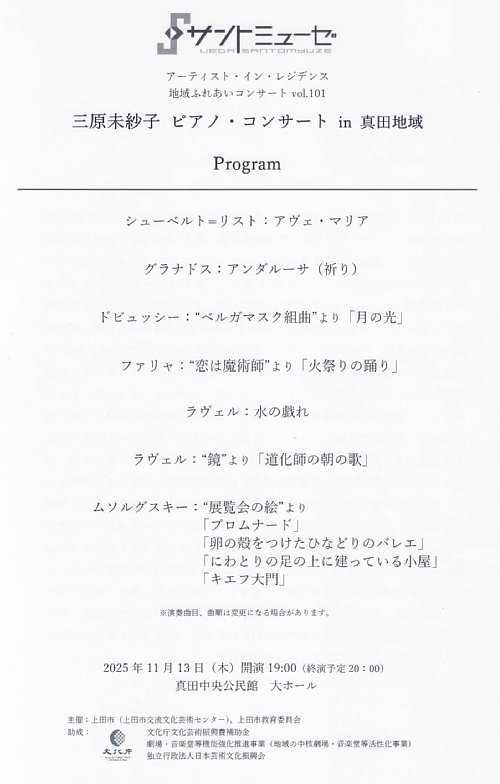 開催日:2025.11.13(木) 19:00開演場所 :真田中央公民館 大ホールサントミューゼのアーティスト・イン・レジデンス 地域ふれあいコンサートVol.101 三原未紗子ピアノ・コンサートin 真田地域へ行ってきました。プログラム1.シューベルト=リスト:アヴェ・マリア2.グラナドス:アンダルーサ(祈り)3.ドビュッシー:ベルガマスク組曲より「月の光」4.ファリャ:恋は魔術師より「火祭りの踊り」5.ラヴェル:水の戯れ6.ラヴェル:鏡より「道化師の朝の歌」7.ムソルグスキー:展覧会の絵より 「プロムナード」 「卵の殻をつけたひなどりのバレエ」 「にわとりの足の上に建っている小屋」 「キエフの大門」アンコール8.ラヴェル:亡き王女のためのパヴァーヌレポート演奏曲目は、11月11日の城南地域と同じため、曲ごとのレポートはいたしましせんが、改めて生演奏は一期一会ということを感じながらのひとときになりました。このあたり、CDなどで繰り返し音楽を聴ける現代にあっても生演奏がなくならないのは、CDはスタジオで録音した演奏を繰り返し聴けるだけであって、変わることはない…。でも生演奏は、11月11日と同じ曲であっても今日の演奏は確実に変わっている…そんなことを想いながら鑑賞させていただいた次第です。あと余談ながら、今回の公演で、三原氏はいっさい楽譜を見ない完全暗譜での演奏をされましたが、これはプロなんだから当たり前的に思われがちではありますが、アマチュアながら演奏活動をしている立場からすると1フレーズ暗譜するのも相当大変なのに、60分のプログラムをすべて暗譜するってどれだけ練習すればよいのだろう…と気が遠くなるところであり、これは心からリスペクトした次第です。一説によればこの暗譜演奏はクララ・シューマンが始めたことらしいのですが、思い返せば、金子三勇士氏や高橋多佳子氏といった日本を代表するピアニストも暗譜演奏しており、本当に皆さんすごい練習を重ねた賜物として実現されているのだろうなと感じました。まとめ三夜連続の公演の締めくくりは、終演後に三原氏と直接会話させていただく機会に恵まれましたが、その会話の中で、ステージ上のアーティストは、演奏に集中しているから客席を見ていないようでいて、じつはよく見ているということに改めて気が付きました。そういえばMCの時に「先日の公演でお見かけした方もまたお越し下さいましてありがとうございます!」というようなことを言われていたので、やっぱりそうだったか!と思った次第です。