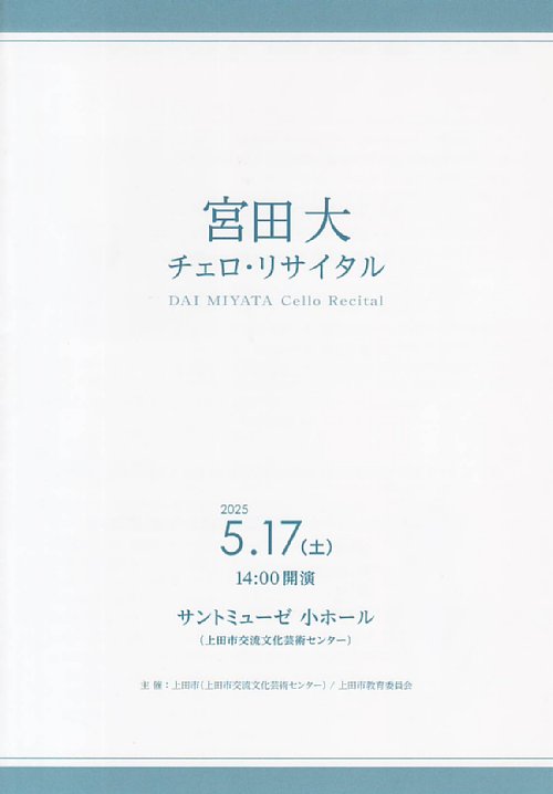 開催日:2025.5.17(土) 14:00開演場所 :上田市交流文化芸術センター サントミューゼ小ホール(320名収容)宮田大チェロ・リサイタルへ行ってきました。プログラム前半1.グラズノフ:吟遊詩人の歌 作品712.ニコライ・リムスキー=コルサコフ(山本清香編曲): ファンタジー・オブ・アラビアン・ウェーブ 「シェヘラザード 作品35」より-チェロとピアノ版3.プロコフィエフ:チェロ・ソナタ ハ長調 作品119 第1楽章 アンダンテ・グラーヴェ 第2楽章 モデラート 第3楽章 アレグロ・マ・ノン・トロッポ後半4.エンニオ・モリコーネ(山中惇史編曲):Moricone's Chinema Medley5.レスピーギ:リュートのための古風な舞曲とアリア 第3組曲 第1楽章 イタリアーナ 第2楽章 宮廷のアリア 第3楽章 シチリアーナ 第4楽章 パッサカリアアンコール6.リヒャルト・シュトラウス:Morgen!(明日)7.ファリャ:火祭りの踊りレポート吟遊詩人の歌 作品71オープニングは、人間の声に最も近い楽器と言われるチェロの音色が際立つ哀愁あふれるグラズノフの名曲でスタートしました。そして宮田氏より今回のリサイタルのテーマとして「物語」が挙げられ、先のアナリーゼワークショップでもお話のあった楽曲に対するイメージ付けを強く意識した演奏を感じることができました。ファンタジー・オブ・アラビアン・ウェーブ 「シェヘラザード 作品35」より昨年の群馬交響楽団・上田定期演奏会2024秋のメインプログラムの1つでもあり、それに先立つ関連プログラムでもソロコンサートマスターの伊藤文乃氏によるヴァイオリンとピアノによる編曲版を聴いた印象が残る中での鑑賞となりましたが、プログラムノートによれば、2021年の宮田大リサイタルツアーCプログラムで初披露された新しい編曲版であるとのことで、おなじみのシェヘラザードではあるものの、宮田氏独自の世界観のようなものを感じるひとときになりました。またシェヘラザードは、千夜一夜物語の語り手であるシェヘラザードを題材にした曲なので、テーマ「物語」のマストをゆく選曲と感じました。チェロ・ソナタ ハ長調 作品119先のアナリーゼワークシッョプでもふれられたこともあり、イメージとしては「あの王様の曲だな!」という風情で聴かせていただきました。演奏前に宮田氏から、それぞれの楽章について王様の行動が一通り話され、そんなことを想像しながら楽しませていただきました。こちらもテーマ「物語」を強く感じるとともに、宮田氏が曲を演奏する時に大切にしているというイメージを想像すること…これは、宮田氏のツイッターを見てもわかりますが、楽譜にびっしりとそのイメージが記載されており、そのイメージを持って演奏されている様子にアマチュアながら音楽に携わる自分として学ぶべきところが多くあると感じたひとときになりました。Moricone's Chinema Medley後半の1曲目は、昨年3月のリサイタルでも共演したピアニストであり作曲家である山中惇史氏によるとてもお洒落な編曲で、ガブリエルのオーボエをモチーフにした導入部から、ニュー・ハネマ・パラダイスといったモリコーネの名曲群をオーソドックスなメドレー形式ではなく、山中氏の作曲家としての創造を加えた新しい楽曲という形で楽しませていただきました。リュートのための古風な舞曲とアリア 第3組曲演奏に先立って宮田氏より、第1楽章<イタリアーナ>、第2楽章<宮廷のアリア>、第3楽章<シチリアーナ>、第4楽章<パッサカリア>について、1曲づつイメージが語られ、全く違うキャラクターを持つ組曲とのことで、こちらもまた「物語」を想像しながら楽しませていただきました。またこの曲は、約1年前に私自身も演奏したことがあり、そこで得た演奏者視点での印象も合わせて2倍楽しむといった様相で、メインプログラムの最後を大いに楽しませていただきました。Morgen!(明日)アンコール1曲目は、リヒャルト・シュトラウスの歌曲とのことで、宮田氏より昨今の世界情勢などから混沌とした世の中ではあるけれど、無事に明日を迎えられたらいいな!という想いを込めて演奏しますというお話がありました。まさに歌うチェロによるその美しい調べに癒されたひとときになりました。火祭りの踊りアンコール2曲目は、激しい曲で締めくくりたいということでタイトル通りの情熱に溢れたファリャの代表曲の1つの演奏となりました。私の中でこちらの楽曲は、2022年4月の加藤文枝 チェロ・コンサートにおいての演奏の印象が強く残っていて、あの曲か!とピンときた次第です。まとめ今回の公演は、チケット発売日のお昼までにチケットが完売してしまったそうで、普段は使われないバルコニー席のステージ横・奥も開放して最大定員の372名収納での完全な満員御礼となるほどで、宮田氏の人気ぶりが伺えるところでした。また宮田氏は昨年のリサイタルシリーズで初めてレジデントアーティストして上田の地に長期で滞在されたようですが、今年も大ホールでリサイタルを行うなど、上田との縁が深まり、今後また演奏