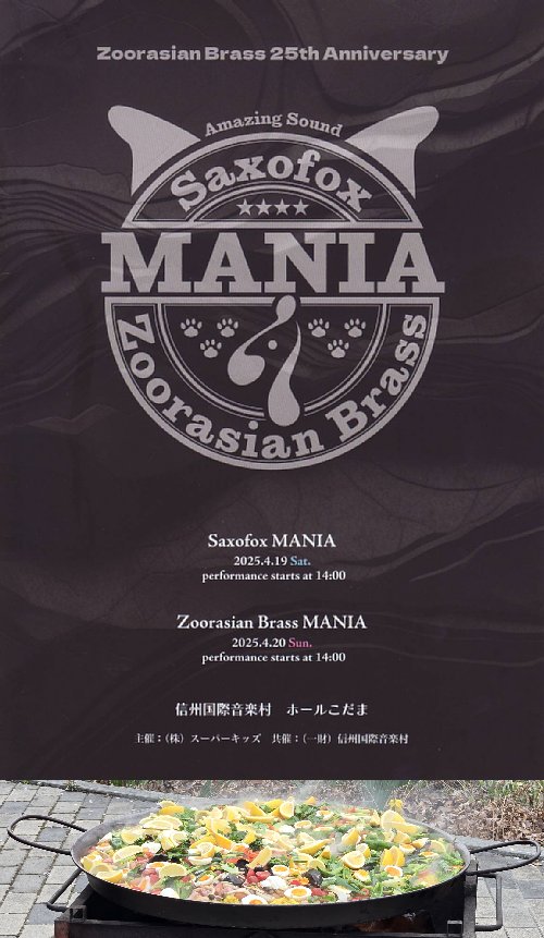 開催日:2025.4.19(土) 14:00開演場所 :信州国際音楽村 ホールこだま(300名収容)サキソフォックス・マニア with Beth&Namakemono inすいせん祭りに行ってきました。プログラム第1部1.おもちゃの兵隊の観兵式2.SHORT SHORTS3.ズルい女4.トリッチ・トラッチ・ポルカ第2部5.ポロネーズ第6番変イ長調「英雄」6.リクエストコーナー7.津軽海峡・冬景色8.Funk de 茶色の小瓶第3部9.サルベージ大作戦10.ラ・クンパルシータ11.ピンク・パンサーのテーマ12.宝島アンコール1曲あり 曲目不明レポートおもちゃの兵隊の観兵式今回のプログラムは、サキソフォックスがこれまでに5枚リリースしたアルバムの中から2枚目の「サキソフォックスのとっておき」の曲を中心に構成したとのことで、まずはご挨拶がわりにとのことで、おなじみのこちらの楽曲でのスタートとなりました。SHORT SHORTSおなじみのメンバー紹介のあと、1958年リリースのアメリカン風の曲の演奏となりました。曲想がサクソフォーンの音色とよくマッチしており、イメージとしてはちょっと悪めの4つ子キツネたち…といった風情を感じました。ズルい女パーカッションのナマケモノちゃんが加わっての演奏となりました。この曲はシャ乱Qの代表曲ですが、ありがとう~さようなら!という歌詞が脳裏によみがえってきて、シャ乱Qの雰囲気がとても良く出ていて、懐かしく聴かせていただきました。トリッチ・トラッチ・ポルカピアニストのベスちゃんが加わって、総勢7名での演奏となりました。ピアノは一人で音楽が完結する楽器なので、いっきに音楽の幅が広がり、先に加わったパーカッションのナマケモノちゃんとともに、生誕200周年のシュトラウス2世の話題性もあいまって、とてもスケールの大きな音楽を楽しませていただきました。ポロネーズ第6番変イ長調「英雄」第2部の始まりは、恒例のピアノによる独奏演奏となりました。ショパンを代表する楽曲ですが、生で聴ける機会は意外と少なく、今年2月に数年ぶりに高橋多佳子氏による英雄ポロネーズをやっと聴けた感がありましたが、今日のベスちゃんの演奏はじつにダイナミック。スケールが大きくて感動した次第ですが、これだけの演奏をするピアニストっていったい誰なのだろう…手は見えても顔が見えないだけにとても気になるところです。リクエストコーナー(サザエさんメドレー)サザエさんメドレー、アンパンマンのマーチ、オオカミなんかこわくないの3曲からのチョイスとなりましたが、拍手の一番大きかった曲ということで…なのですが、キツネさんたちはその決定方法にいつも納得していない様子で、それを知ってか知らずか今回はデシベル計測器を用意して科学的根拠に基づく納得の決定となりました。とはいえキツネさんたちの好みがそれぞれ違うことから、わかってはいても決定を巡っての喜怒哀楽がまた楽しいところでした。津軽海峡・冬景色マルゴーくんのテナーサクソフォーンをフィーチャーした演奏となりました。演奏を聴いて改めてテナーの魅力を感じるところがありましたが、歌の曲を演奏するのは難しい…というのは器楽演奏あるあるなのかなとも言えますが、まるで歌っているかのように演奏するのはさすがと感じました。Funk de 茶色の小瓶今まさに全世界を混乱に陥れているアメリカの民謡ですが、アメリカ民謡とはすなわちジャズのことなのかな?ということで、ここ数年ニューオーリンズスタイルのBBBBの演奏を聞いてきていろいろと感じるところがある中で、原曲の形を残しつつ、これだけカッコいいアレンジになっているのは素晴らしいと感じました。サルベージ大作戦(絆ノ奇跡)こちらですが、そもそもサルベージとは沈没船を引き上げることなので、音楽的にはボツになった曲を引き上げて演奏するという意味を持つとのことでした。そんな中で選ばれたのがこちらの楽曲とのことで、この曲は、「鬼滅の刃」刀鍛冶の里編の楽曲であり、なるほど鬼滅らしい曲だと感じました。ラ・クンパルシータ「息が合わない」キツネさんたちの新しい挑戦は、タンゴの名曲であるこちら。いつものようにラトゥール君がおとぼけ役となり、会場の笑いを取るとともに和やかな雰囲気で楽しませていただきました。ピンク・パンサーのテーマサプライズとしてナマケモノちゃんが、客席横の扉から怪しげなサングラスを装着してトライアングルを鳴らしながら登場。曲が持つ妖艶な雰囲気を最大限に生かしつつの演奏となりました。宝島宝島といえば真島俊夫氏による吹奏楽アレンジが最も有名なところですが、サクソフォーンとパーカッション、ピアノによるアレンジもまたステキだなと感じました。まとめ今回もプログラムが配布され、全体を通して次に来る曲がわかった状態で楽しませていただきました。また次の日に行われるズーシアンブラスマニアのブログラムも掲載されており、一石二鳥感がありました。そして今回は、演奏後に行われるB.Y.O.B.パーティーにも参加させていただきました。こ