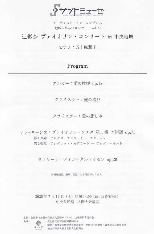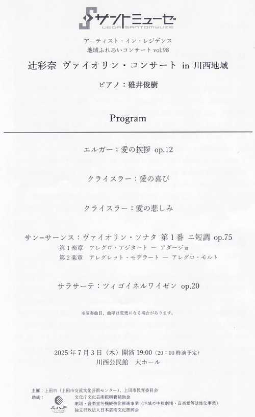 開催日:2025.7.3(木) 19:00開演場所 :川西公民館 大ホールサントミューゼのアーティスト・イン・レジデンス 地域ふれあいコンサートVol.98 辻彩奈ヴァイオリン・コンサートin 川西地域へ行ってきました。プログラム1.エルガー 愛の挨拶 op.122.クライスラー 愛の喜び3.クライスラー 愛の悲しみ4.サン=サーンス ヴァイオリン・ソナタ 第1番 ニ短調 op.75 第1楽章 アレグロ・アジタート-アダージョ 第2楽章 アレグレット・モデラート-アレグロ・モルト5.サラサーテ ツィゴイネルワイゼン op.20アンコール6.マスネ タイスの瞑想曲レポート愛の挨拶 op.12多くのアーティストがコンサートのオープニングに選ぶ名曲中の名曲ですが、それだけに演奏する方の個性がより感じ取りやすいということで、このあたり課題曲の聴き比べという感覚に似たものがあるのかなと感じました。そして辻彩奈氏の個性ははしっかりとした太い音色とよく通る澄み渡った高音がとてもステキな印象でした。愛の喜び・愛の悲しみ辻氏よりヴァイオリンの音色がより美しくきこえるように作られたクライスラーの楽曲ですという紹介がありました。またこの2曲は愛の悲しみの方がやや演奏頻度は高い印象がありますが、セットで演奏されることも多いのかもしれません。私自身は愛の喜びの底抜けに明るい表現が好みですが、愛の悲しみの哀愁にあふれた作風もまた心に染み入るところです。ヴァイオリン・ソナタ 第1番 ニ短調 op.75辻氏いわく「私の挑戦!」ということで、人前で演奏するのは今日が初めてという宣言があり、聴き手としても気合が入りました。またこの曲をやるなら本日のピアニストであり、小学校5年生の時のマスタークラスの講習会で出会ってから長いつきあいのある碓井俊樹氏と一緒にと決めていたそうで、そんな強い想い入れを感じながらの演奏となりました。2楽章あわせて25分ほどの大曲でしたが、辻氏の気迫は相当なものがあり、特に2楽章後半ではその音量に圧倒され、ソリストとしての確固たる力量を目の当たりにした次第です。なおこの曲は、8月31日のサントミューゼでのリサイタルのプログラムとしても挙げられているので、今から楽しみというところです。ツィゴイネルワイゼン op.20ヴァイオリンと言えば!ということで紹介がありましたが、昨年7月のレジデントアーティストだった南紫音氏もこの曲を地域ふれあいコンサートの2公演で演奏しており、その時の紹介でサラサーテは手が小さかったが、それを逆手にとった超絶技巧がこの曲!ということで、辻氏の手がヴァイオリニストとして大きいか小さいのかはわかりませんが、弱奏部の繊細な表現から始まって超絶技巧がさく裂する後半まで目を片時も目を離せない演奏を大いに楽しませていただきました。タイスの瞑想曲ヴァイオリンリサイタルではかなり演奏頻度の高い有名曲になりますが、アンコールでの演奏と考えると、チャルダッシュと人気を二分しているのかな?という印象があります。そして辻氏のタイスの瞑想曲はやはり格別なものがあり、レジデントアーティストして続くこれからの数公演への期待感が膨らむところでした。まとめ辻彩奈氏は、2022年の郡馬交響楽団上田定期演奏会でサン=サーンスのヴァイオリン協奏曲のソリストとして登場し、その圧倒的な実力はもちろん、伸びやかで澄んだ音色は天性の才なのかと思わせるところがありましたが、昨年の軽井沢大賀ホール2024春の音楽祭 辻彩奈&阪田知樹デュオ・リサイタルを拝聴する機会を得て、さらにその想いを強くしたところで、今回サントミューゼのレジデントアーティストとして登場するということで、大いに期待して一般向けの最初の公演である地域ふれあいコンサートを聴かせていただきましたが、さらにパワーアップした感と公民館というホールの響きの助けを受けられない状況下にあってもその圧倒的な力量を感じたひとときになりました。