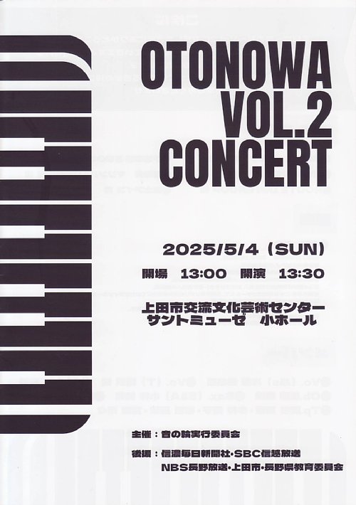 開催日:2025.5.4(日) 13:30開演場所 :上田市交流文化芸術センター サントミューゼ小ホール(320名収容)音の輪Vol.2コンサートへ行ってきました。プログラム前半1.作曲:木下牧子・作詞:まど・みちお/おんがく2.A.ボイト/歌劇《メフィストーフェレ》より「地の果てに近づいた」3.J.D.ゼレンカ/ソナタ第5番 ヘ長調 ZWV1814.V.シェーロコフ/トランペットカルテットの為の3つの小品5.M.ラヴェル(編曲:岩田恵子)/ぼれろぼさのば後半6.E.レハール/メリーウィドウワルツ7.石川亮太/四季のファンタジア8.F.プーランク/オーボエ、ファゴットとピアノの為の三重奏曲9.作詞:浅井洌・作曲:北村季晴(編曲:上村勇希)/信濃の国(音の輪Ver.)アンコール10.久石譲/ジブリメドレーレポートおんがくオープニングは、メゾソプラノとピアノのデュオによる演奏となりました。こちらの楽曲は、2月に行われた長野医療衛生専門学校・音楽療法士学科第41回定期演奏会Happy concertでアカペラ四重唱で取り上げられており、その記憶が残る中での拝聴となったことから、聴いたことある感の中で、新たな要素となったピアノの伴奏も上乗せする形で楽しませていただきました。歌劇《メフィストーフェレ》より「地の果てに近づいた」2曲目はテノールとピアノのデュオによる演奏となりましたが、テノールの力強い歌唱とそれをしっとりと支えるピアノ伴奏がとても心地よいところで、題目の地の果てに近づいたという情景を想像しながら楽しまていただきました。ソナタ第5番 ヘ長調 ZWV181ソプラノサクソフォーン、オーボエ、ファゴット、ピアノのカルテットでの演奏になりました。本来は、オーボエ2本と、ファゴット、ピアノによる曲のようですが、オーボエをソプラノサクソフォーンに変えることで、より曲に色彩感が出て聴き映えがする形になっているように感じました。演奏に先立って、曲名のZWVとは?というお話が出たのでちょっと調べてみたところ、ZWVとは、ゼレンカ・ヴェルケ・フェアツァイヒニスの略であり、日本語ではゼレンカ作品番号または作品総目録番号のことで、バッハだったらBWV、モーツァルトだったらMWVになるとのことでした。トランペットカルテットの為の3つの小品毛色の違う3つの小品を聴き比べできる楽曲ですが、トランペットらしい華やかな音色、対照的な優しい音色、それぞれ感じながら楽しませていただきました。吹奏楽などの合奏体ではトランペットが4人揃うとかなりの迫力が出て、強奏部では正直耳に来る場面もあるのですが、こちらの楽曲を演奏するカルテットの皆さんは、吹奏楽の合奏でよく言われるような全員でf、全員でpみたいなバランス感覚が大変素晴らしく、終始とても心地よい音量で楽曲を感じさせていただきました。ぼれろぼさのば3つの小品を演奏したカルテットがそれぞれトランペットをフリューゲルホルンに持ち替えての演奏となりました。どこかでフリューゲルホルンはトランペット・トロンボーン系の直管楽器ではなく、ユーフォニアム・チューバの系列の楽器であると聴いたことがあるのですが、まさしくそんな雰囲気のまろやかでやさしい音色があふれるボレロとなりました。メリーウィドウワルツメゾソプラノ、テノール、ピアノのトリオでの演奏となりました。この曲は、歌唱もさることながら、メゾソプラノとテノールとの絡みが大きな見どころで、お二人がそれぞれの想いを歌唱し、やがて距離が縮まり、ともに手を取り合って歌唱する形になるのですが、幸せそうなお二人を拝見し、とても暖かい気持ちになりました。四季のファンタジアズーラシアンブラスから発売されているソプラノ&アルトサクソフォーンソロ演奏用の曲で、春から夏まではアルトによる演奏で「花」「朧月夜」「茶摘み」「浜辺の歌」、秋からソプラノに持ち替え「村祭」「紅葉」「赤とんぼ」。そして冬の「ゆき」と「冬景色」。最後はまたアルトでフィナーレという構成ですが、けっこうな尺があるので吹き続ける体力もさることながら、持ち替えもあって吹きこなすのはなかなかヘビーという印象を受けましたが、そのあたりはさすがプロの奏者ということで、素晴らしい演奏で日本の四季を音楽で存分に楽しませていただきました。オーボエ、ファゴットとピアノの為の三重奏曲オーボエ、ファゴット、ピアノでの演奏となりました。オーボエとファゴットとピアノという編成では、わりとメジャーな曲とのことで、ダブルリード楽器の音色の魅力を感じつつ、アンサンブルの妙を存分に楽しませていただきました。またこの曲のタイトルにも書かれているようにオーボエ、ファゴットと「ピアノ」ということで、比重とすればオーボエ+ファゴット二人で1に対してピアノ1という印象で、ピアノの活躍が前面に出てくる場面がけっこうあるように感じました。信濃の国(音の輪Ver.)今回のコンサートの出演メンバー全員での演奏となりました。またこの編成のために上村勇希氏が編曲を行ったとのことで、演奏前にイ